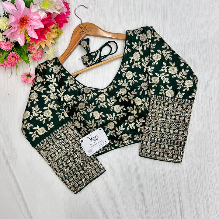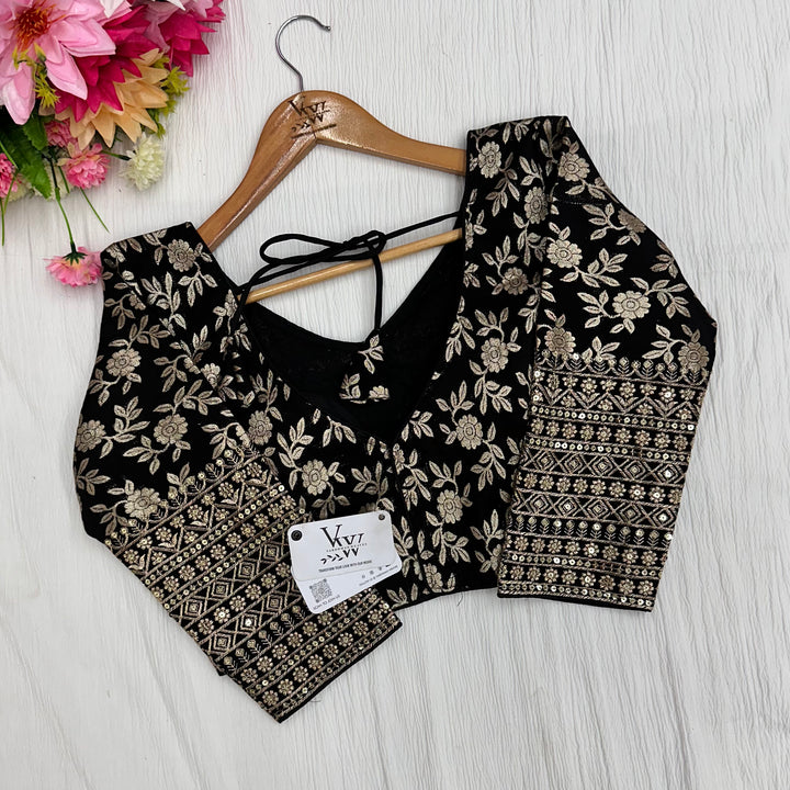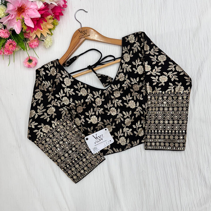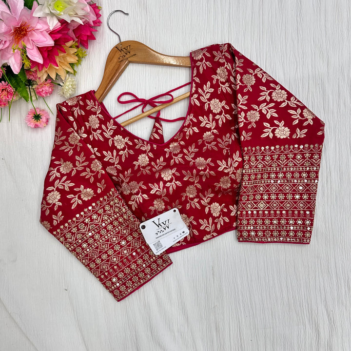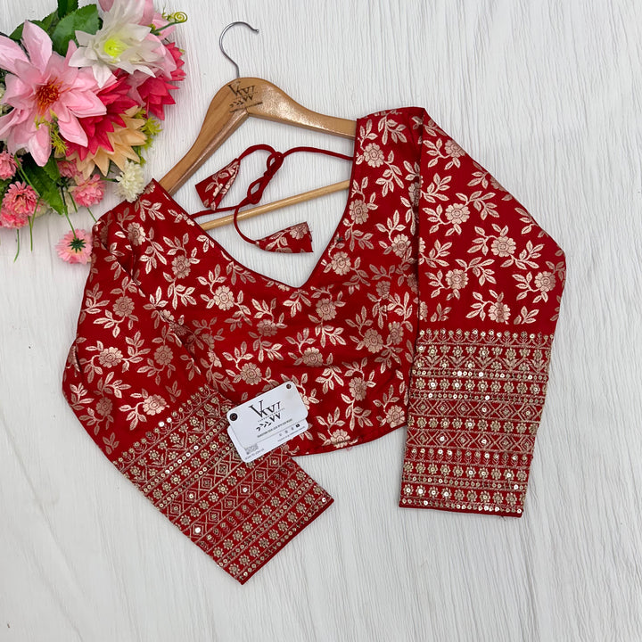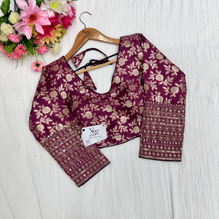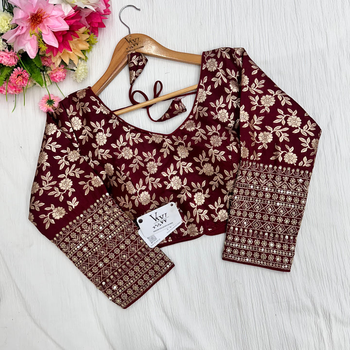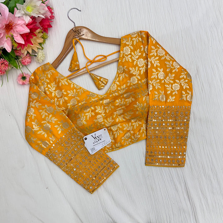 This blouse features beautiful golden jari all over and heavy embroidery work on the sleeves, making it a stunning addition to any outfit. With skillful craftsmanship and attention to detail, this blouse offers both elegance and style. š