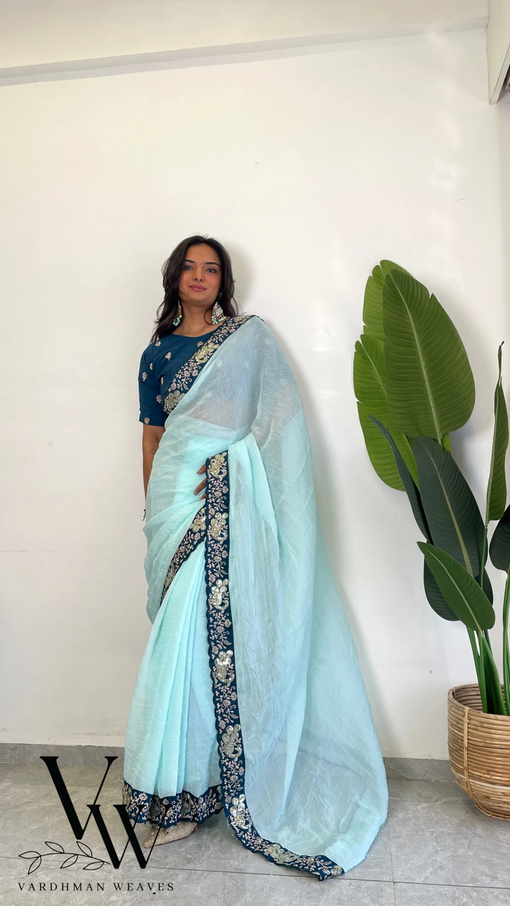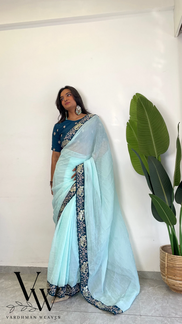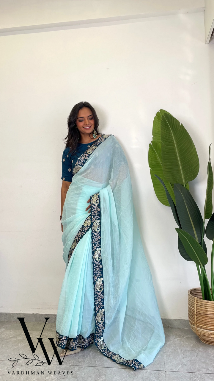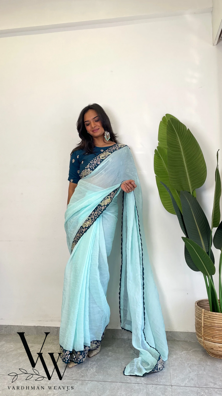 Make a statement with this stunning Crunchy Space Silk Saree, adorned with intricate hand embroidery and sequence work border. The saree's unique texture and sheen are perfectly complemented by the delicate embroidery and sparkling sequences. Paired with an equally exquisite embroidery work blouse, this ensemble is sure to turn heads at any special occasion. The perfect blend of traditional craftsmanship and modern style, this saree is a must-have for anyone who appreciates elegance and sophistication
