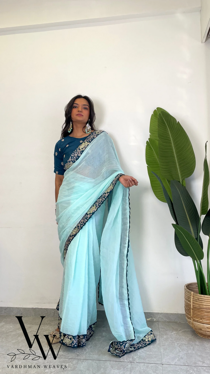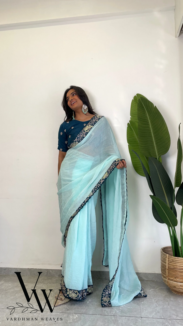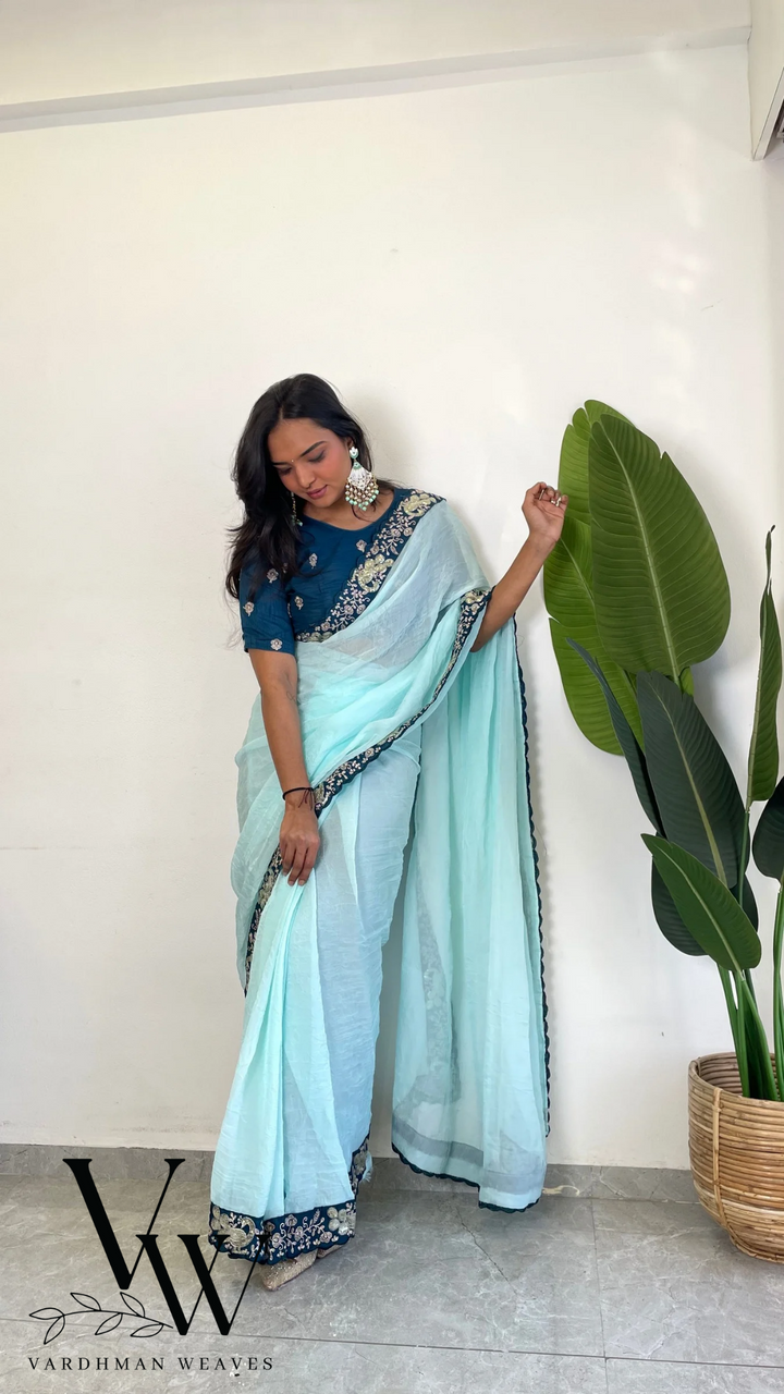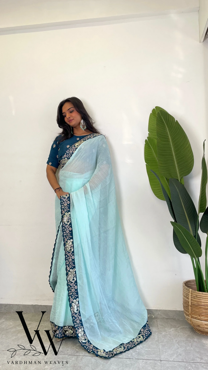 Make a statement with this stunning Crunchy Space Silk Saree, adorned with intricate hand embroidery and sequence work border. The saree's unique texture and sheen are perfectly complemented by the delicate embroidery and sparkling sequences. Paired with an equally exquisite embroidery work blouse, this ensemble is sure to turn heads at any special occasion. The perfect blend of traditional craftsmanship and modern style, this saree is a must-have for anyone who appreciates elegance and sophistication