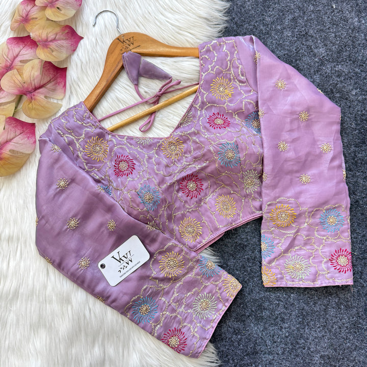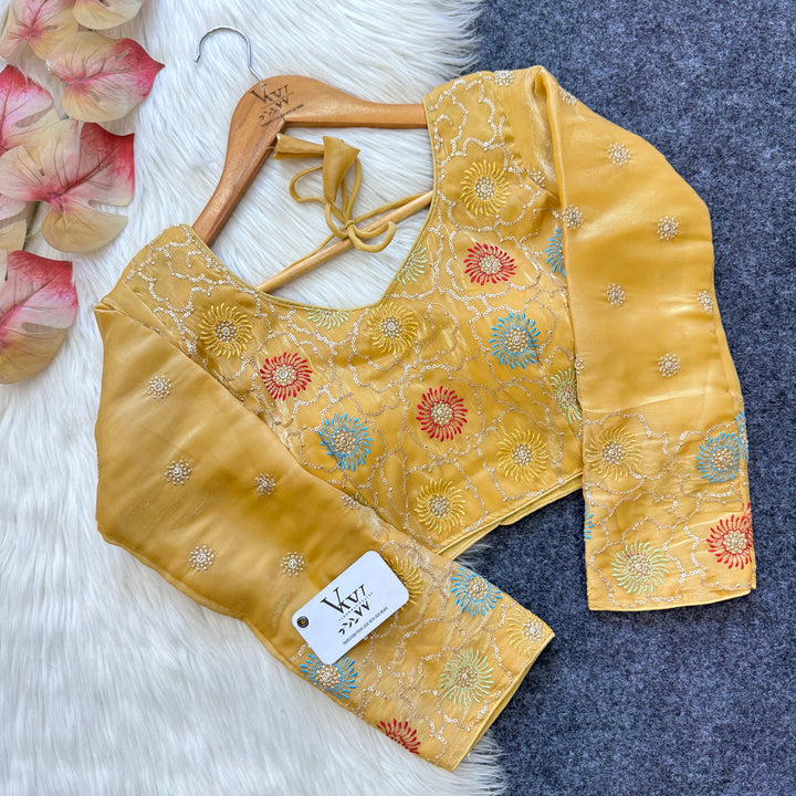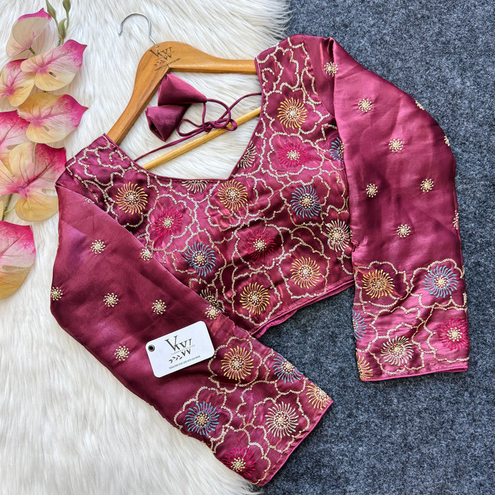 This exquisite blouse showcases intricate heavy multi-threadwork, meticulously crafted with precision and attention to detail. The sequence work adds a touch of glamour, creating a stunning visual effect. The blouse is a masterpiece of handcrafted art, perfect for special occasions or making a statement. The combination of multi-threadwork and sequence work creates a truly unique and eye-catching design