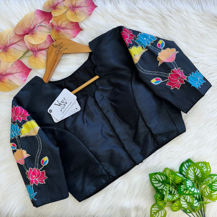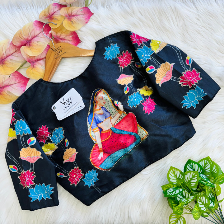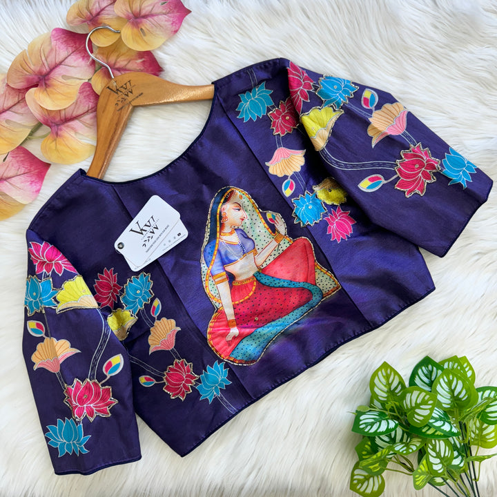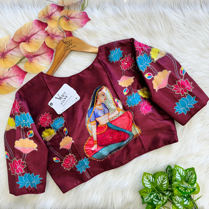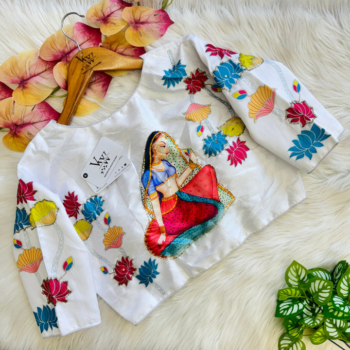 This product features a decent print paired with an antique handcrafted blouse. With this combination, you can elevate your style with a touch of vintage charm and quality craftsmanship. Perfect for those looking for a unique and timeless addition to their wardrobe.