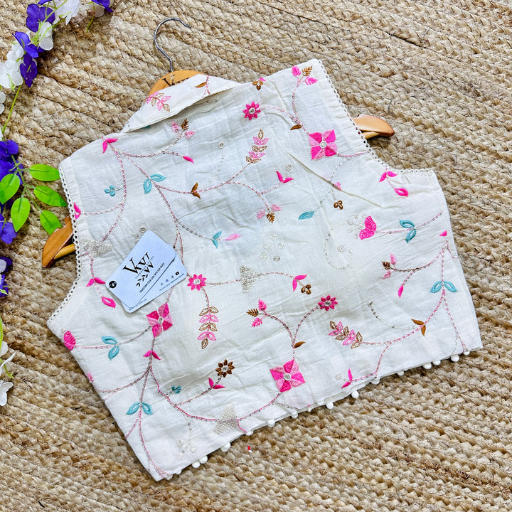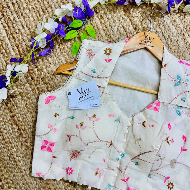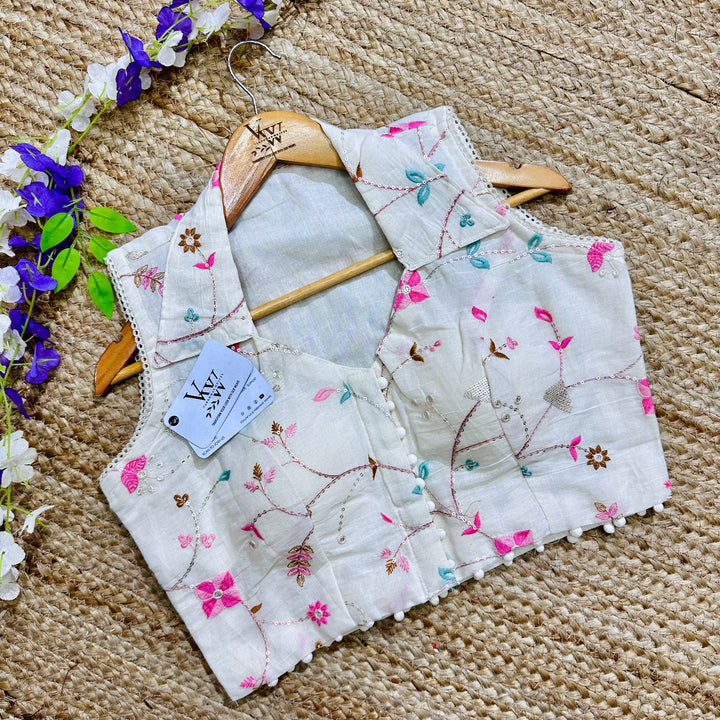 This blouse has a beautiful sleeveless collar neck design and intricate embroidery work all over for a touch of elegance. Perfect for any occasion, it's a stylish and versatile addition to any wardrobe. 😍
