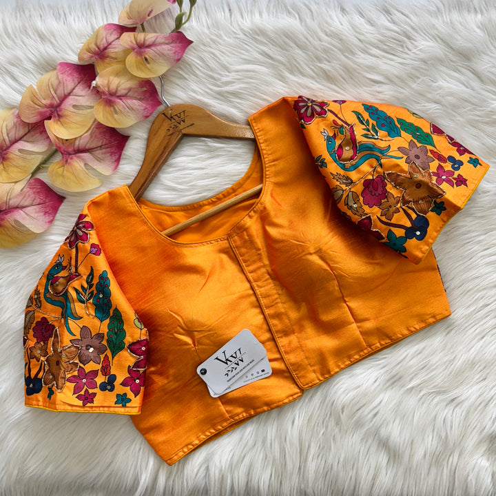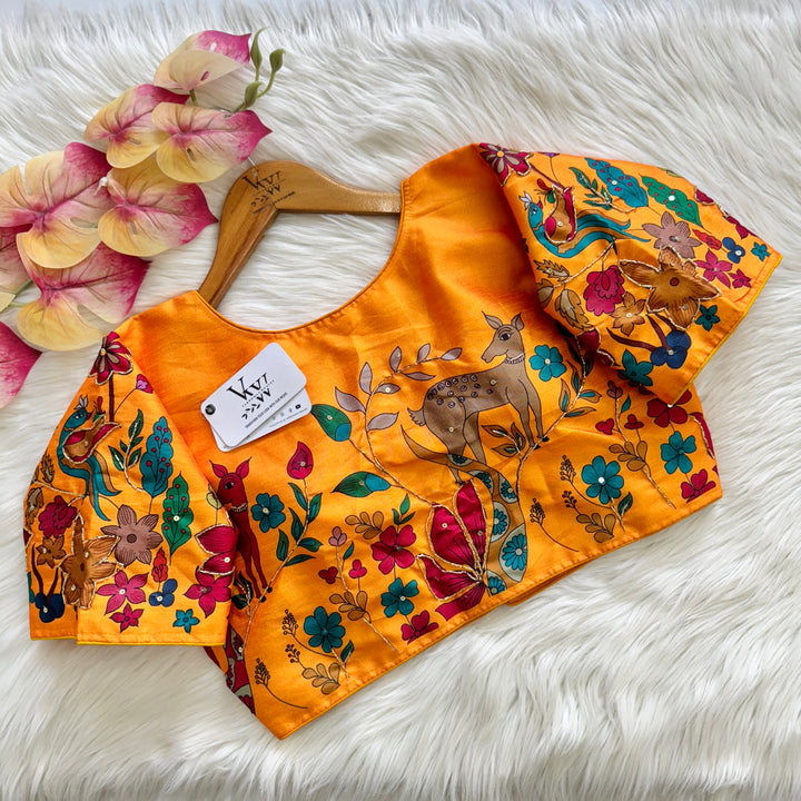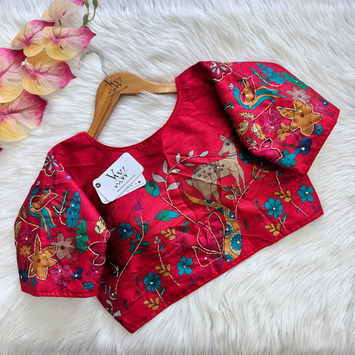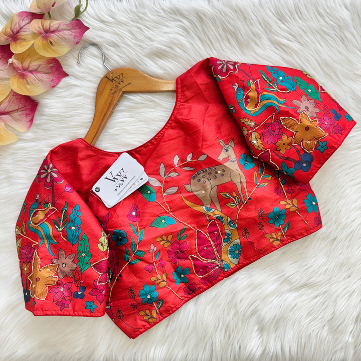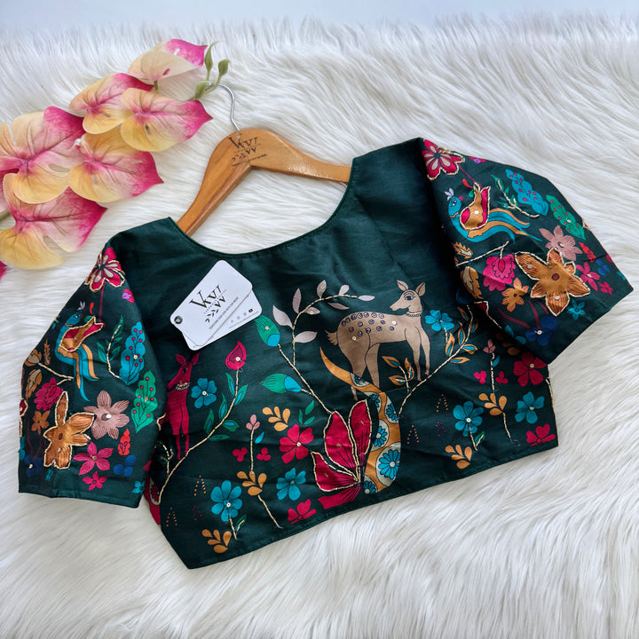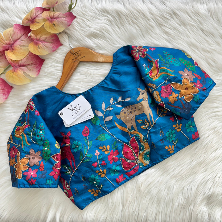 This product features a decent print paired with an antique handcrafted blouse. With this combination, you can elevate your style with a touch of vintage charm and quality craftsmanship. Perfect for those looking for a unique and timeless addition to their wardrobe.