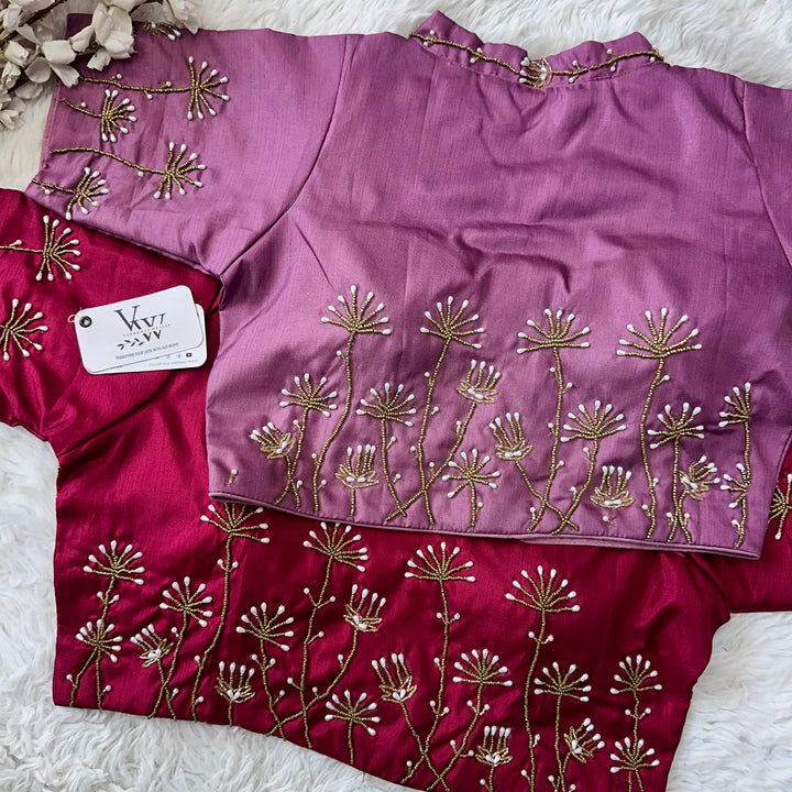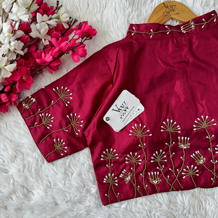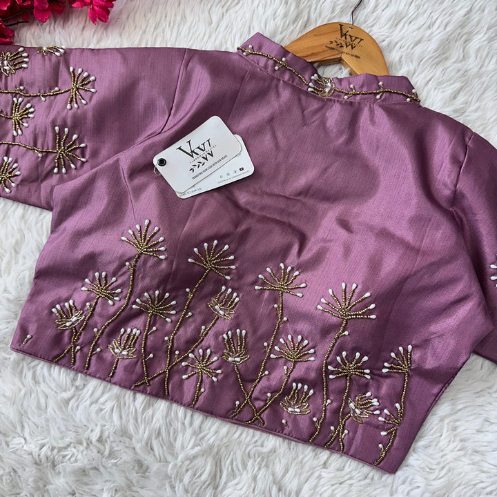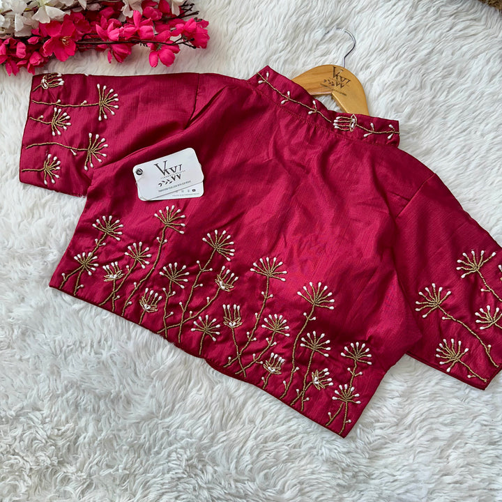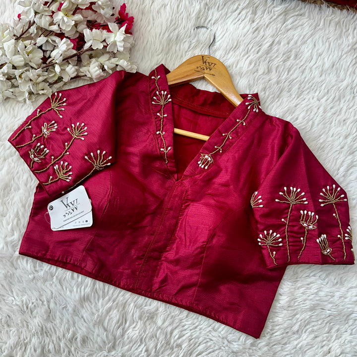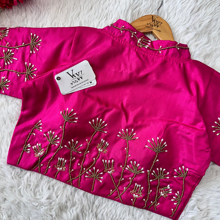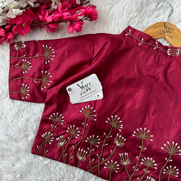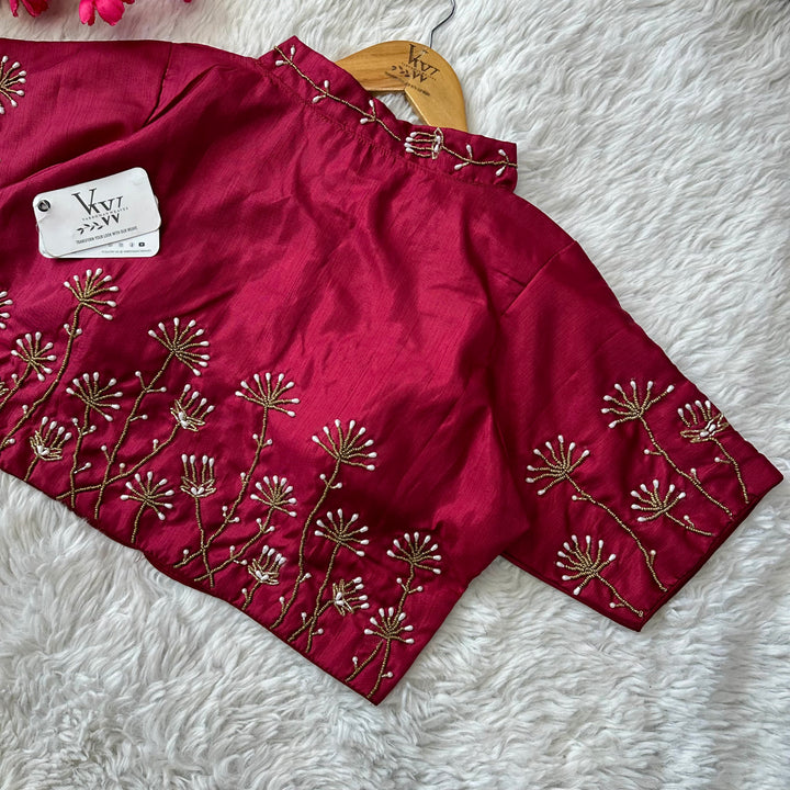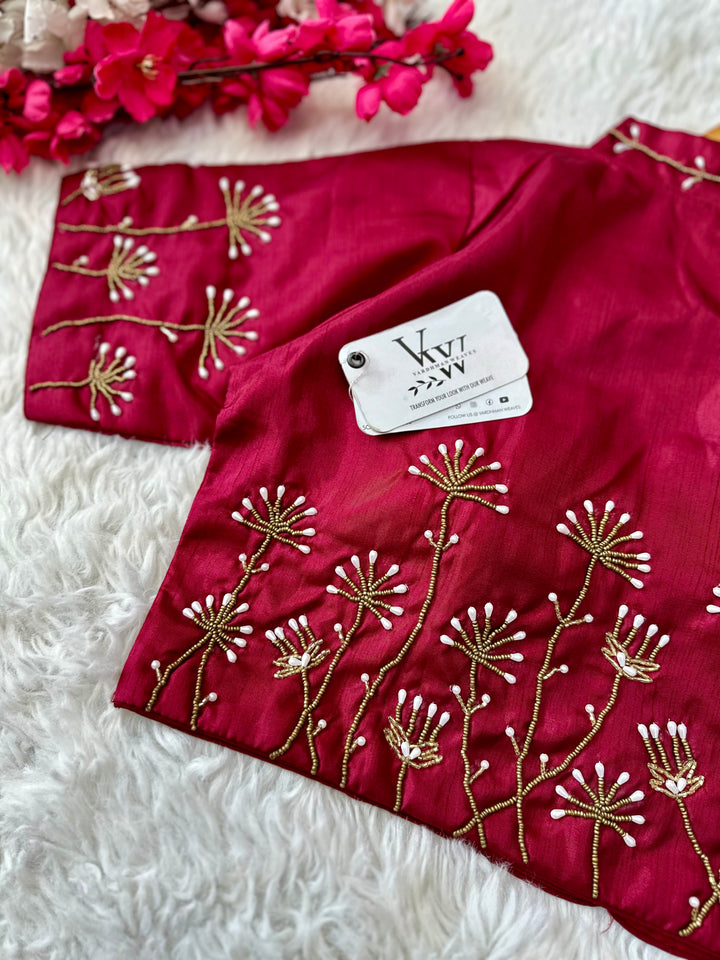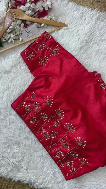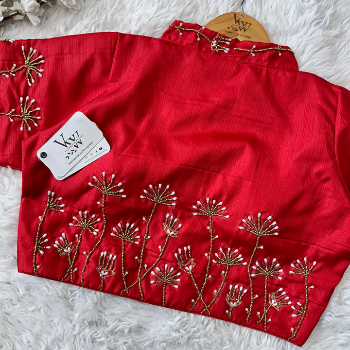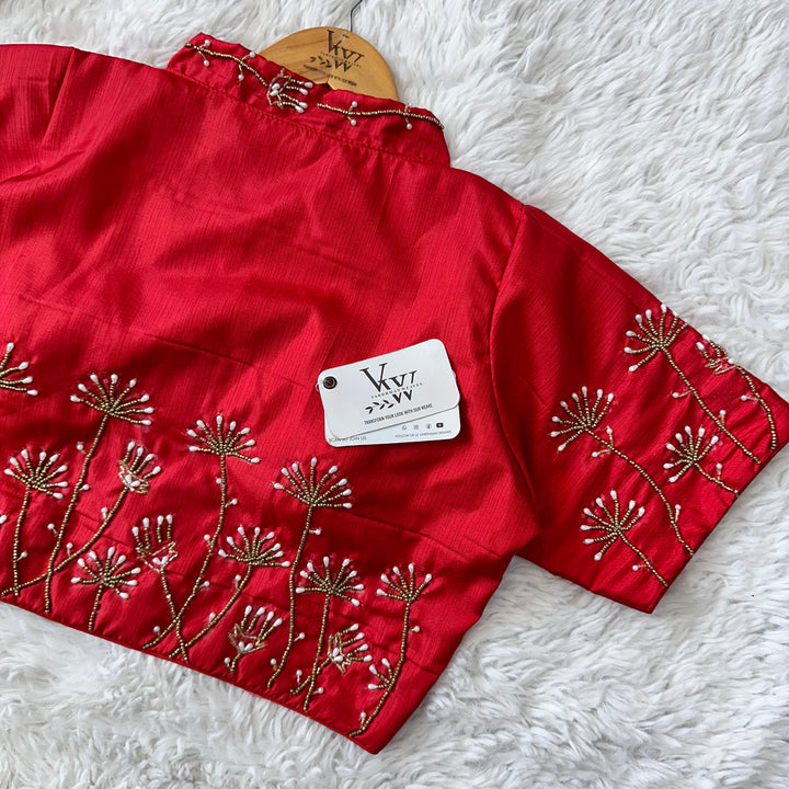 This blouse features stunning handwork all over the back, sleeves, and collar, adding a touch of elegance to any outfit. Handcrafted with care, it showcases intricate details that make it a truly unique and beautiful addition to your wardrobe. Elevate your style and stand out with this exquisite piece.
