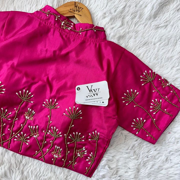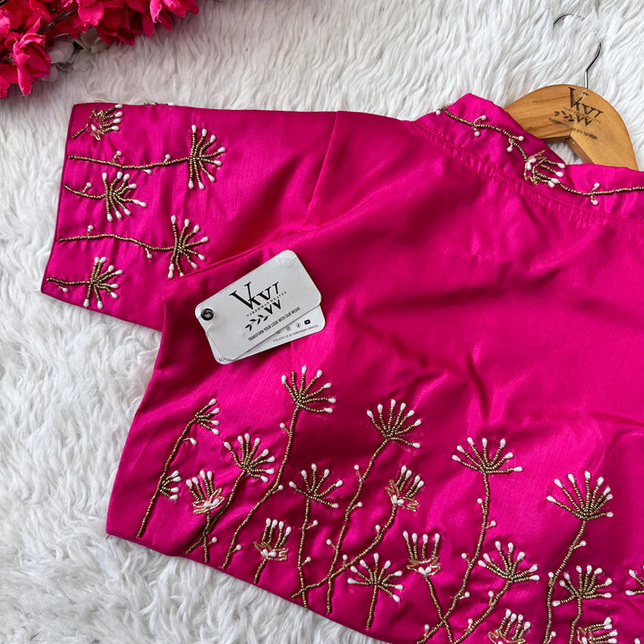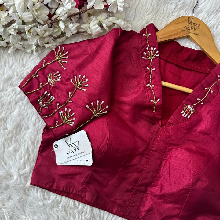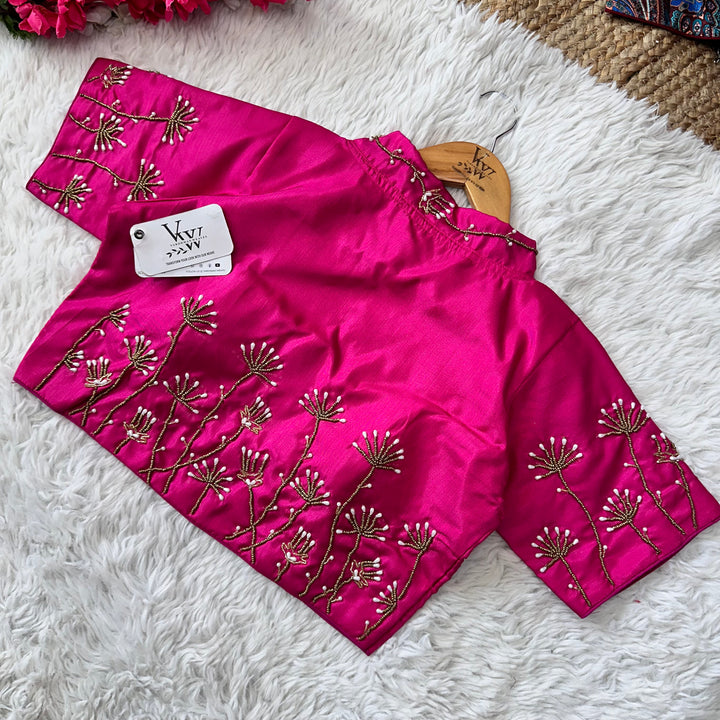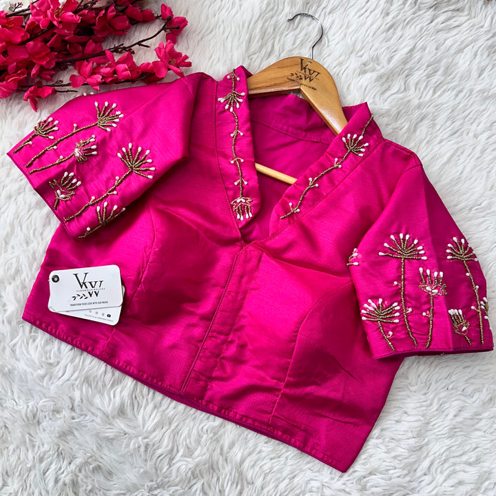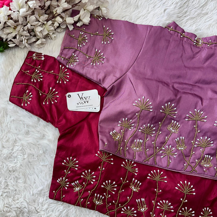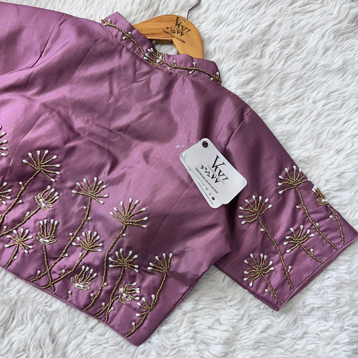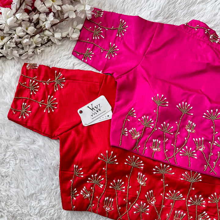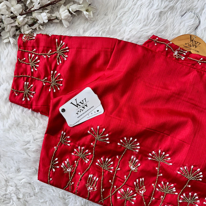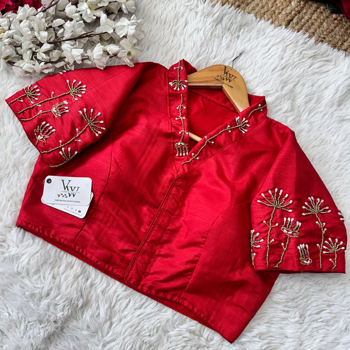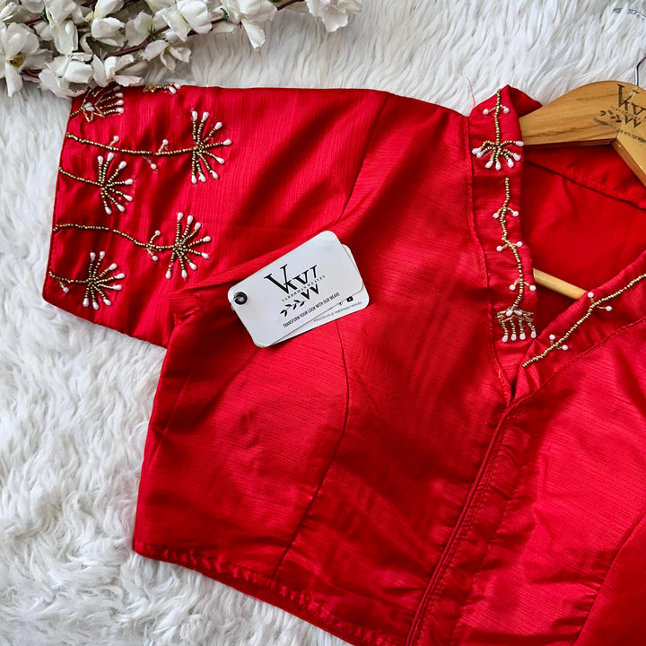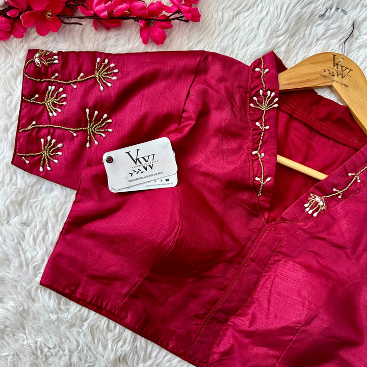 This blouse features stunning handwork all over the back, sleeves, and collar, adding a touch of elegance to any outfit. Handcrafted with care, it showcases intricate details that make it a truly unique and beautiful addition to your wardrobe. Elevate your style and stand out with this exquisite piece.
