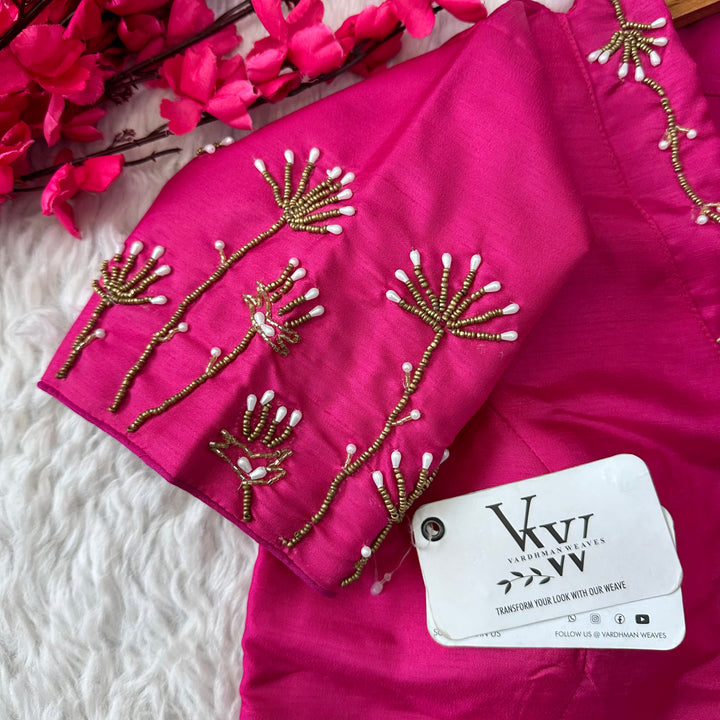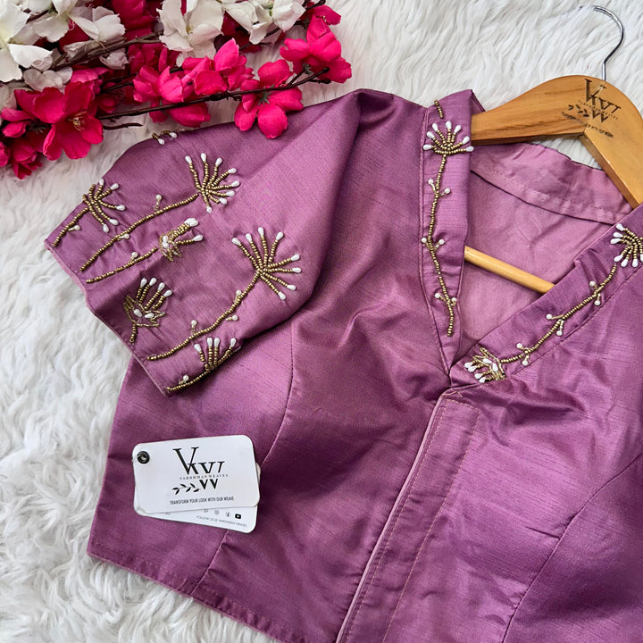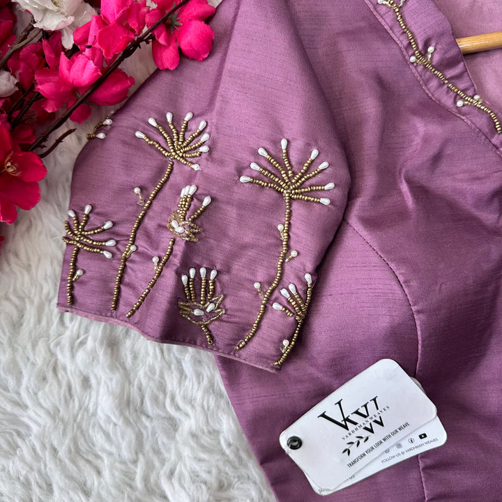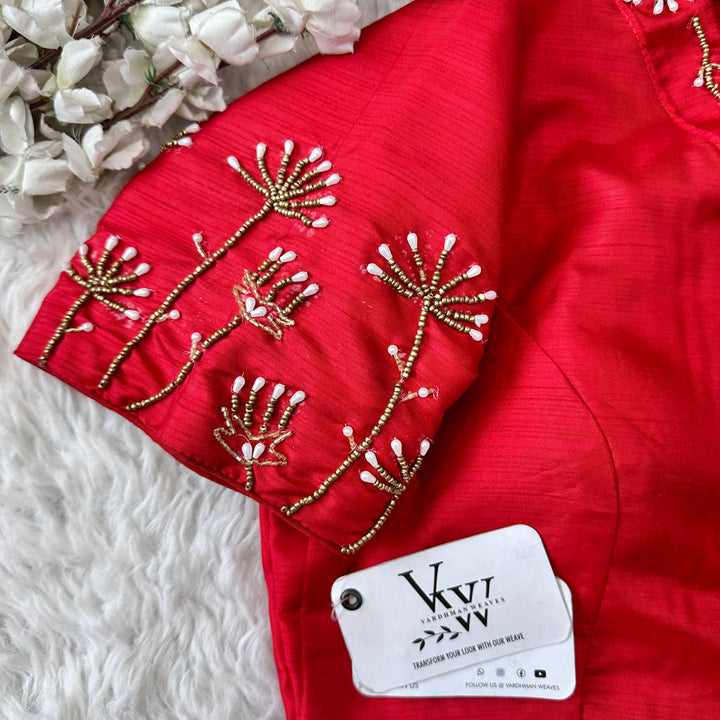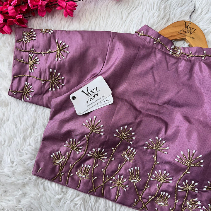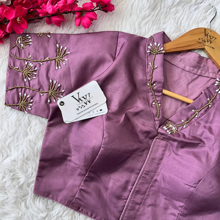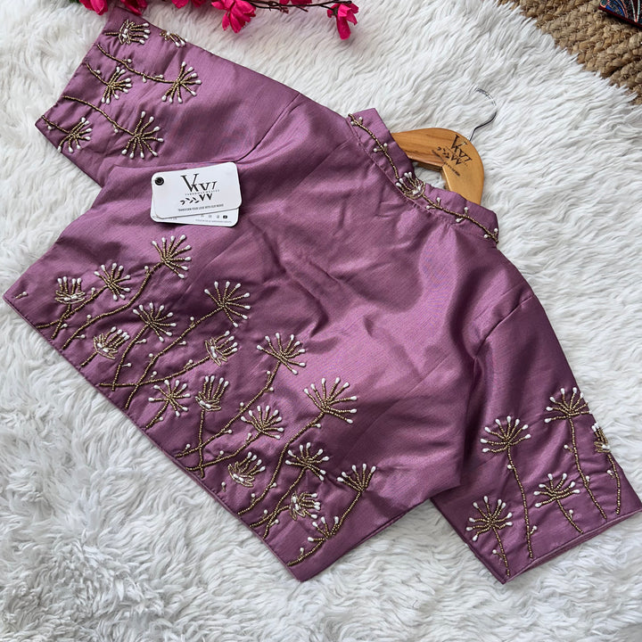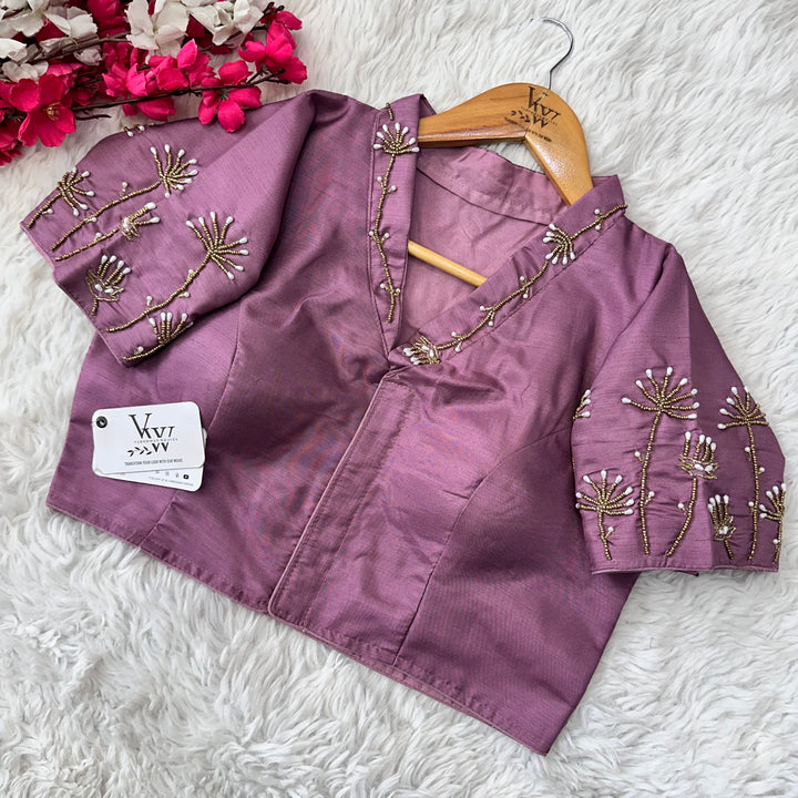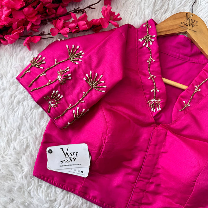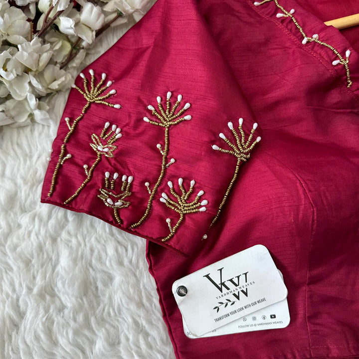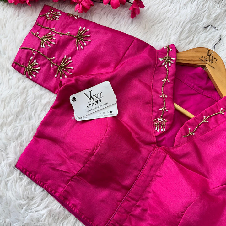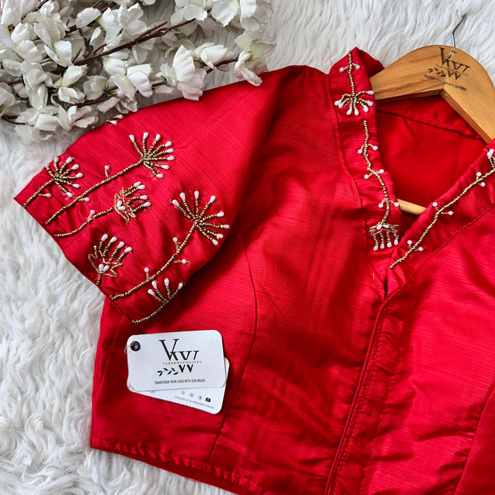 This blouse features stunning handwork all over the back, sleeves, and collar, adding a touch of elegance to any outfit. Handcrafted with care, it showcases intricate details that make it a truly unique and beautiful addition to your wardrobe. Elevate your style and stand out with this exquisite piece.