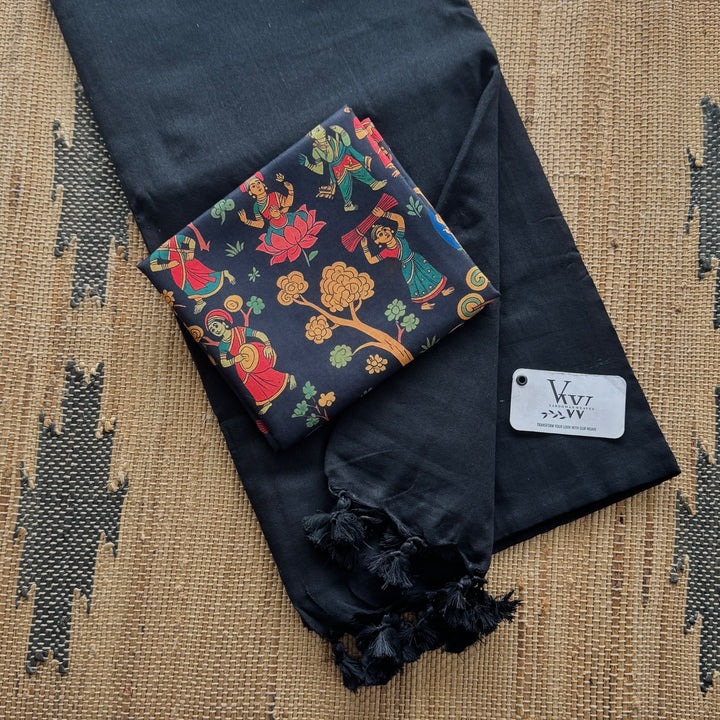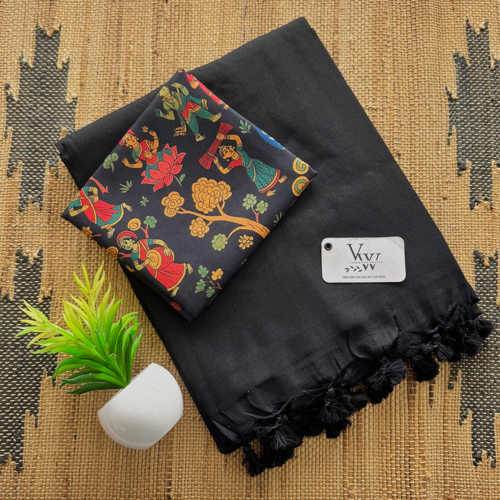 This beautiful cotton saree features intricate tassel details along the pallu, adding a touch of sophistication to the overall design. The saree is paired with a stunning printed blouse, crafted with vibrant colors and patterns that complement the saree perfectly. The combination of comfort and style makes this saree perfect for everyday wear, casual gatherings, or festive occasions