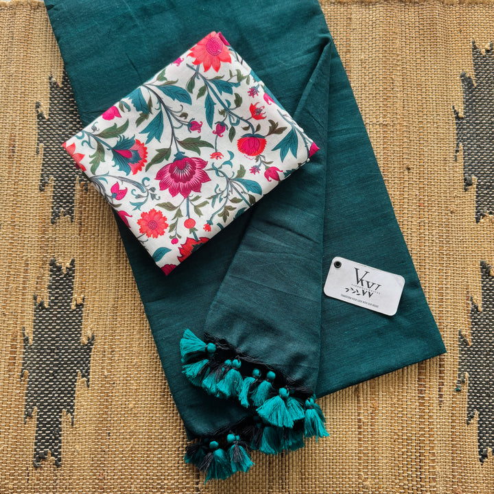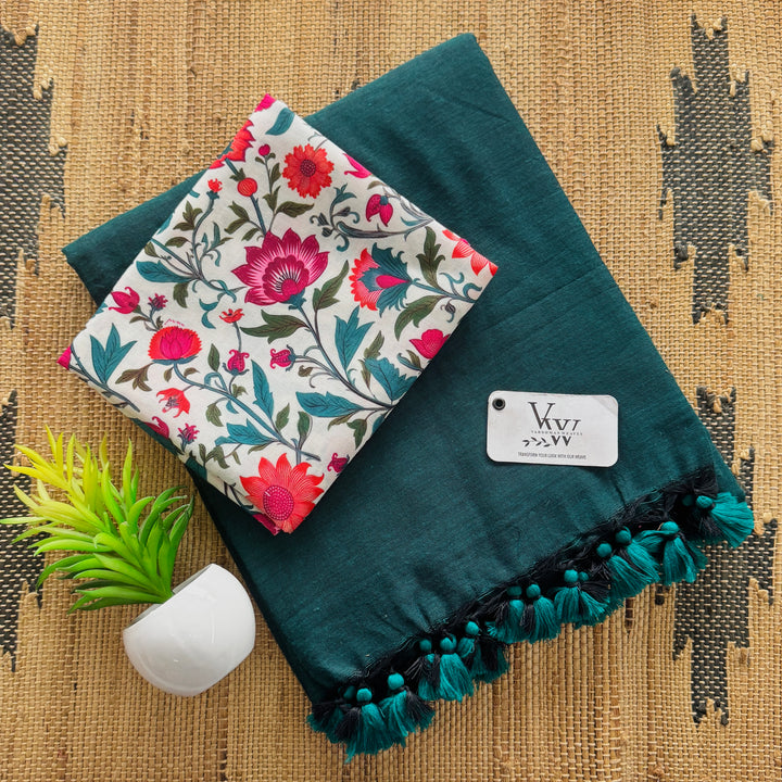 This beautiful cotton saree features intricate tassel details along the pallu, adding a touch of sophistication to the overall design. The saree is paired with a stunning printed blouse, crafted with vibrant colors and patterns that complement the saree perfectly. The combination of comfort and style makes this saree perfect for everyday wear, casual gatherings, or festive occasions