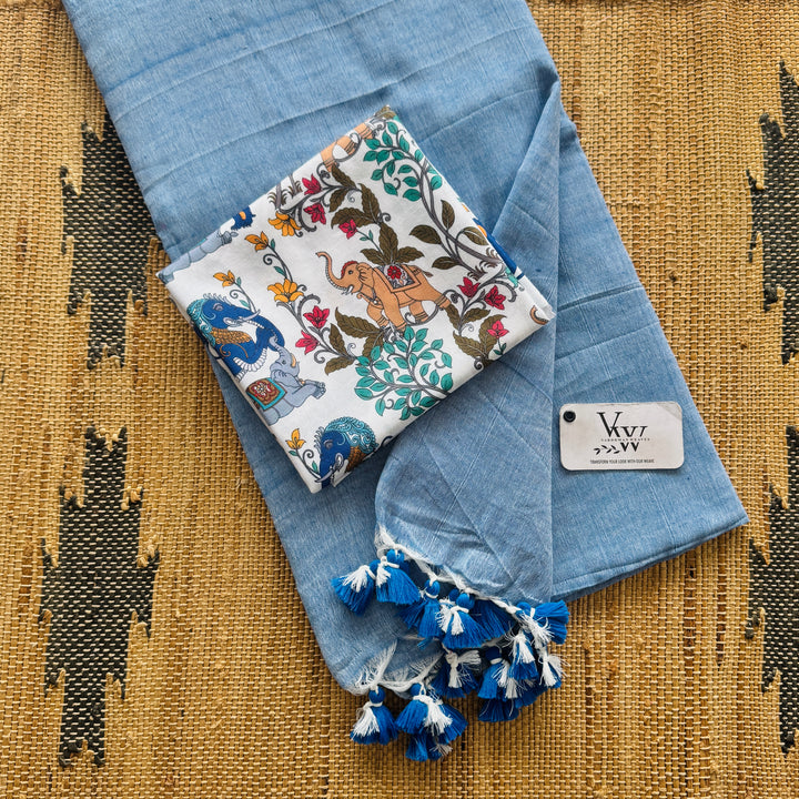 Cotton Saree with Tassels & Contrasting Printed Blouse