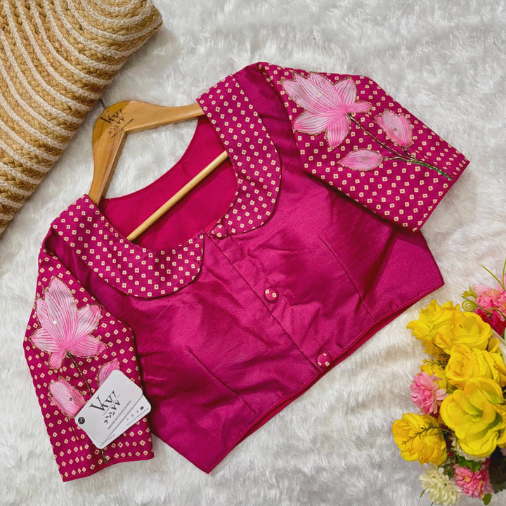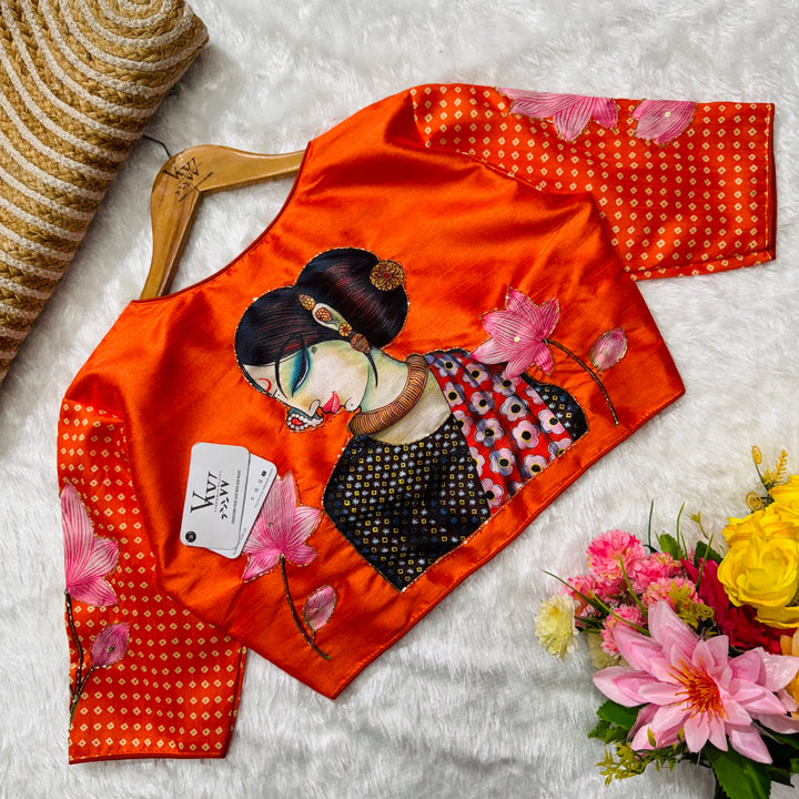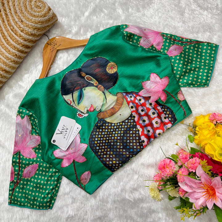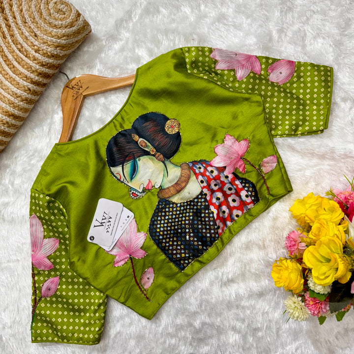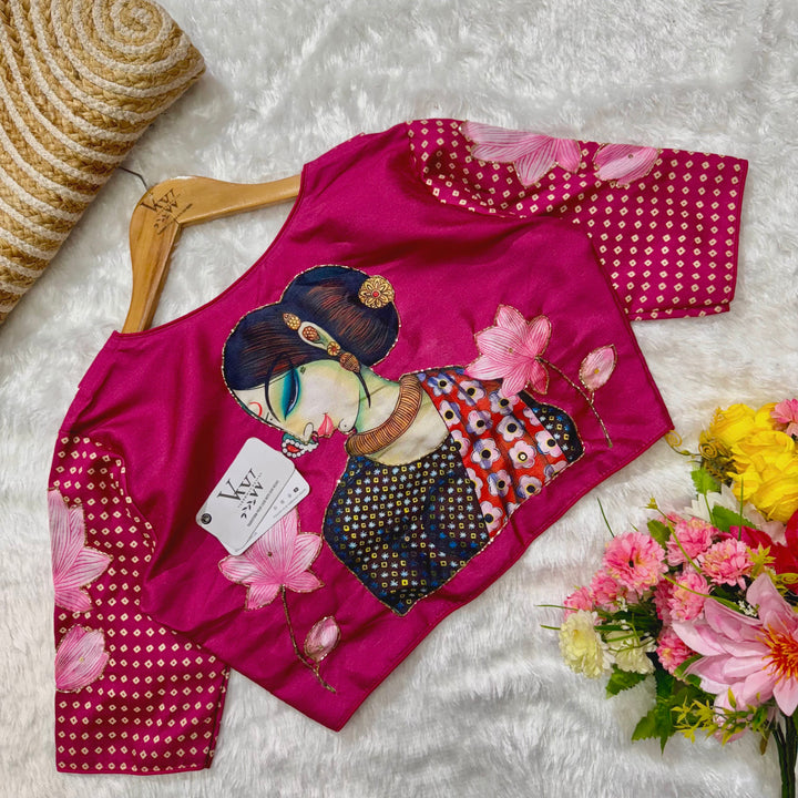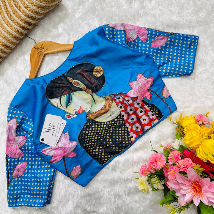 Made with luxurious pure silk fabric, this blouse features a beautiful and intricate print all over. But what truly sets it apart is the antique handcrafted work, adding an exquisite touch to your wardrobe. Elevate your style game with this elegant and timeless piece. š