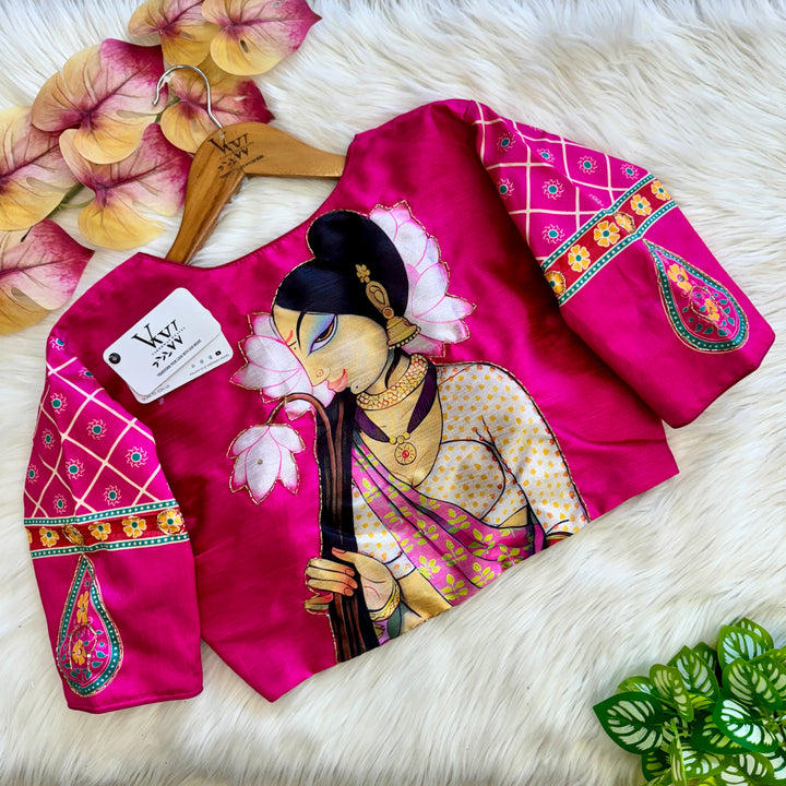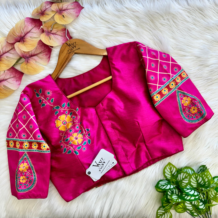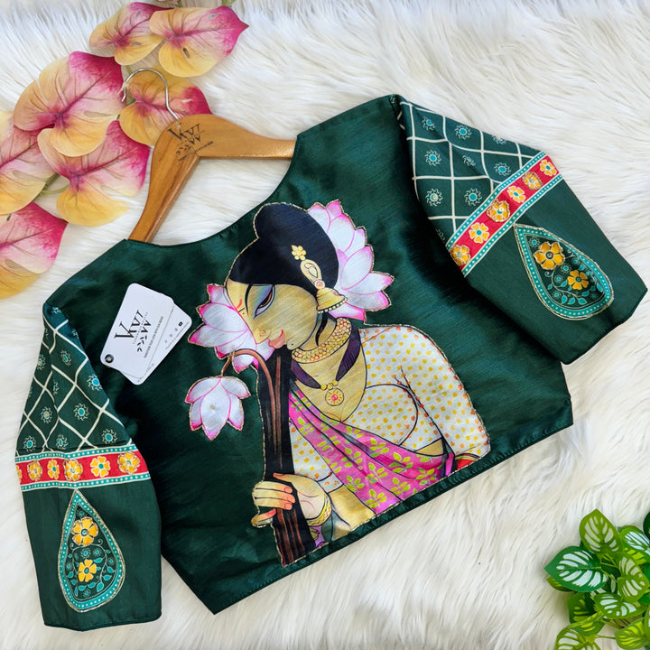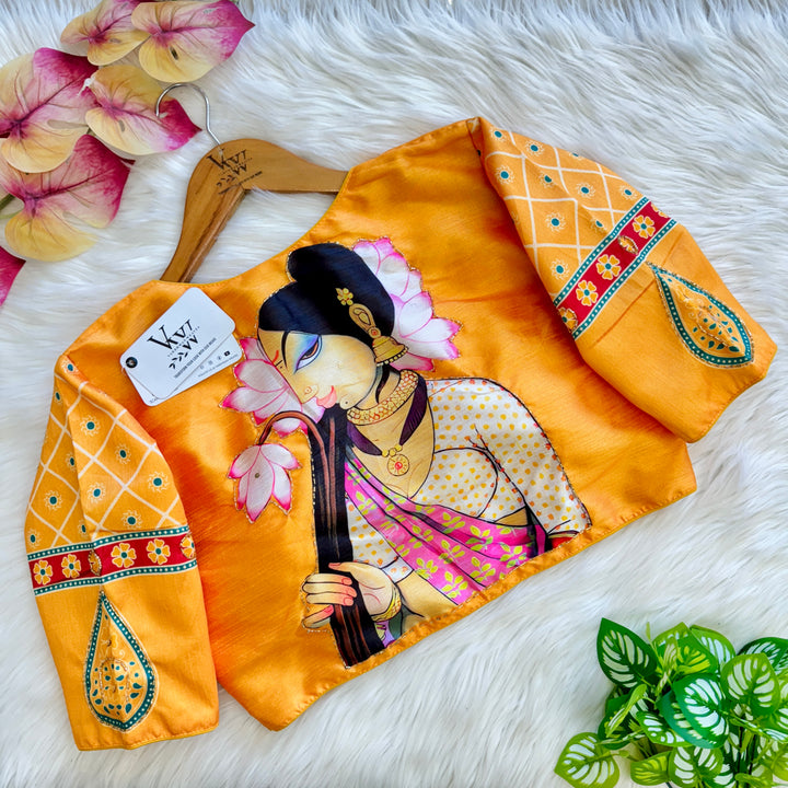 This product features a decent print paired with an antique handcrafted blouse. With this combination, you can elevate your style with a touch of vintage charm and quality craftsmanship. Perfect for those looking for a unique and timeless addition to their wardrobe.