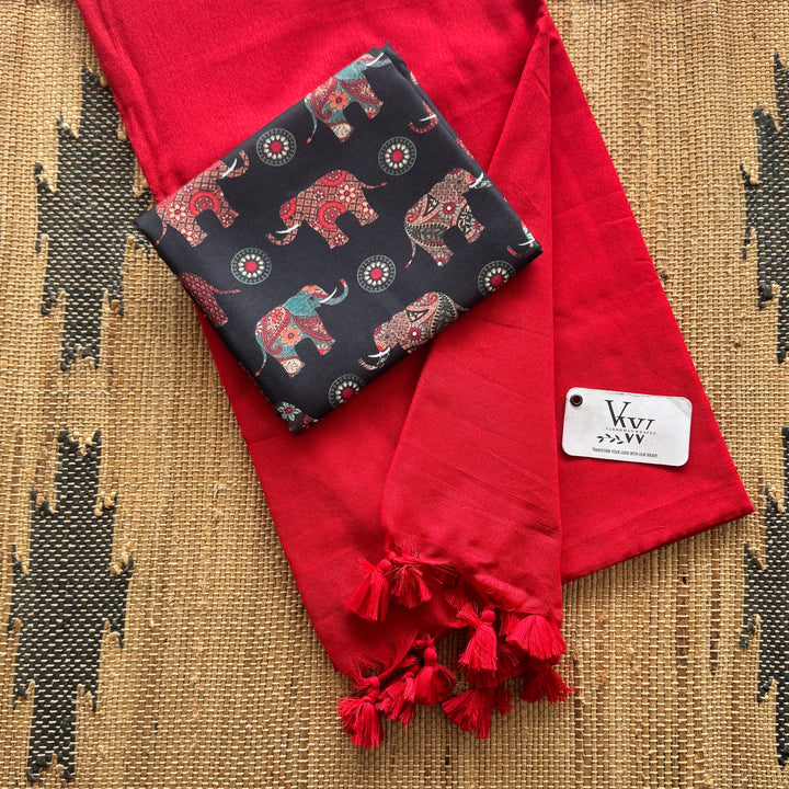 This beautiful cotton saree features intricate tassel details along the pallu, adding a touch of sophistication to the overall design. The saree is paired with a stunning printed blouse, crafted with vibrant colors and patterns that complement the saree perfectly. The combination of comfort and style makes this saree perfect for everyday wear, casual gatherings, or festive occasions