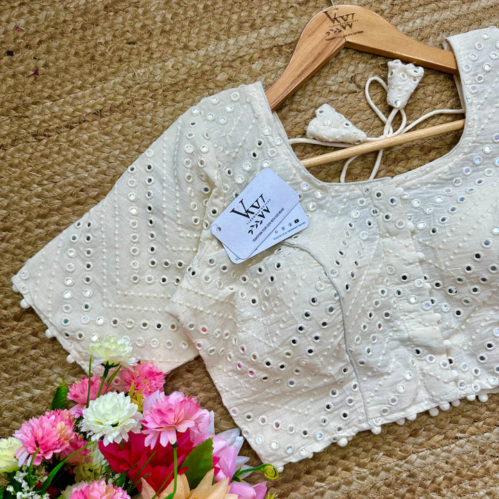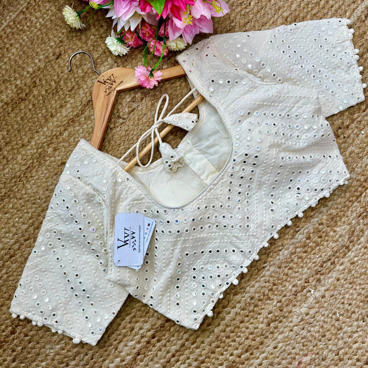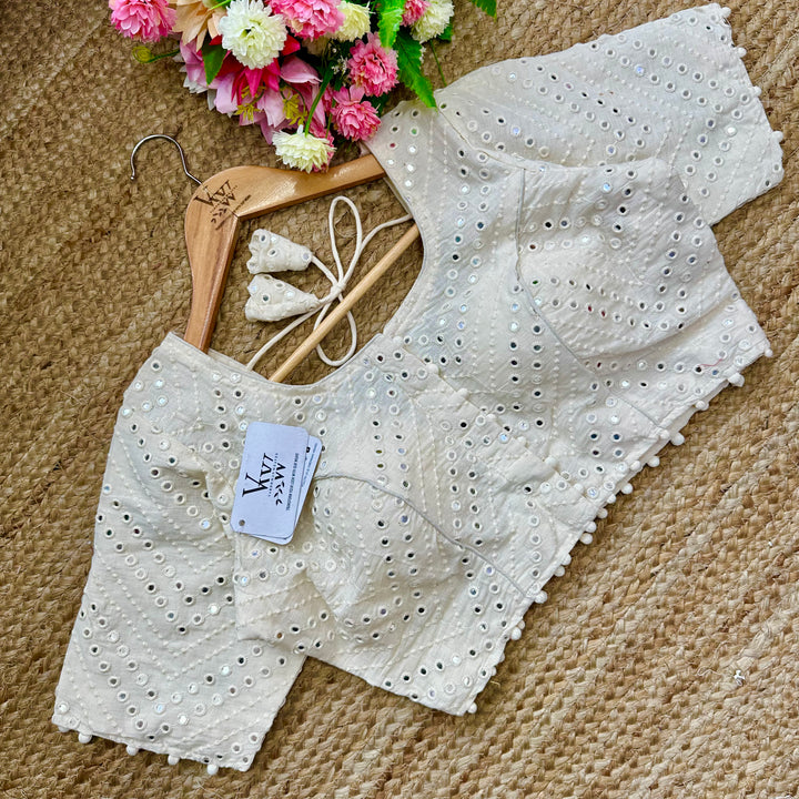 This blouse boasts beautiful multi work embroidery with stunning mirror detailing throughout. Elevate any outfit with this unique and high-quality piece, perfect for any occasion.
