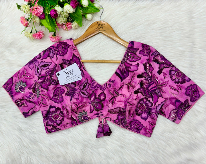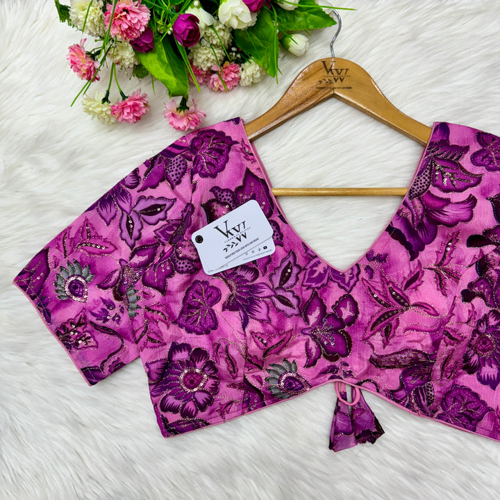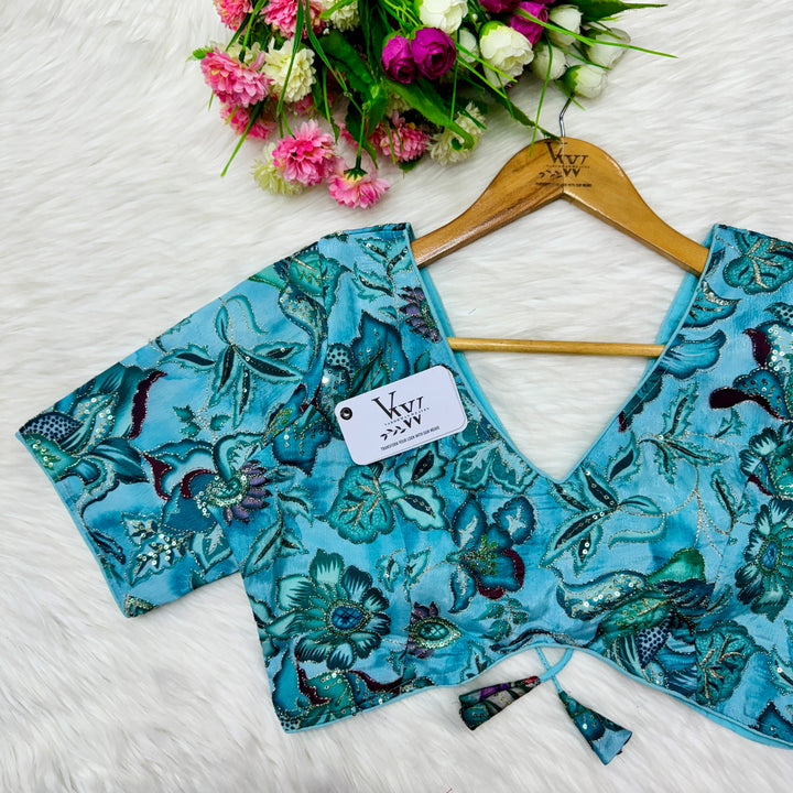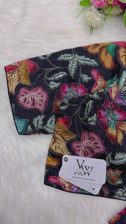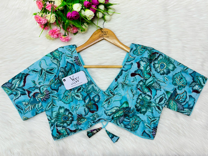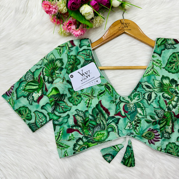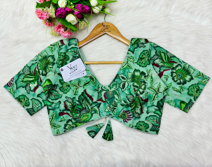 Expertly crafted with intricate golden embroidery and a touch of sequence, this Kalamkari blouse features a stunning all-over print. Elevate your style with this elegant and timeless piece. ✨