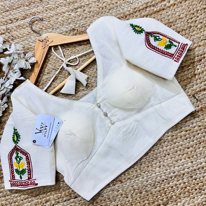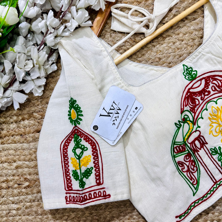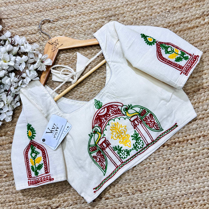 Expertly hand-woven with high-quality pure cotton blend fabric, this blouse boasts intricate and delicate embroidery all over. Experience the ultimate blend of comfort and style with this must-have addition to your wardrobe. š