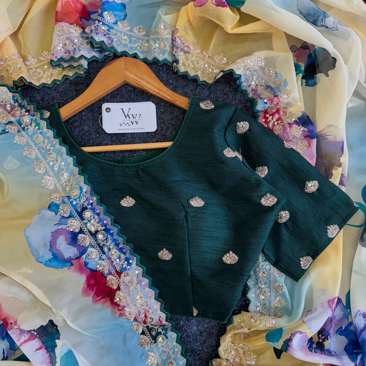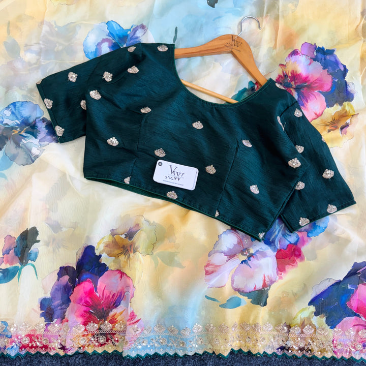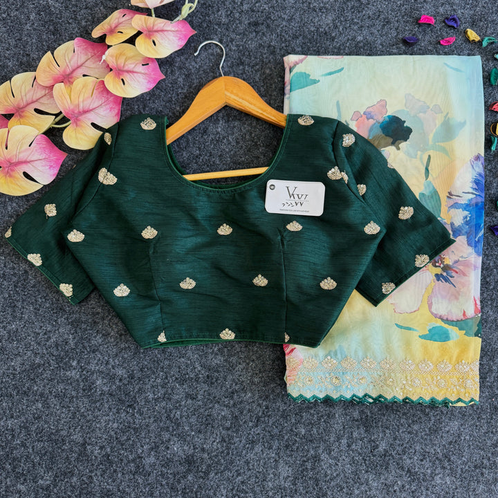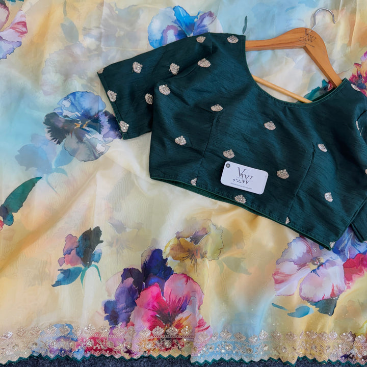 Elevate your style with this stunning Organza saree , intricately embroidered with multi-thread and needlework. The beautiful design creates a unique and eye-catching piece, perfect for special occasions or everyday wear