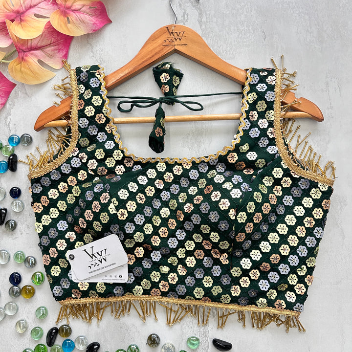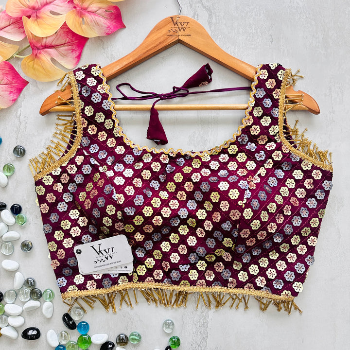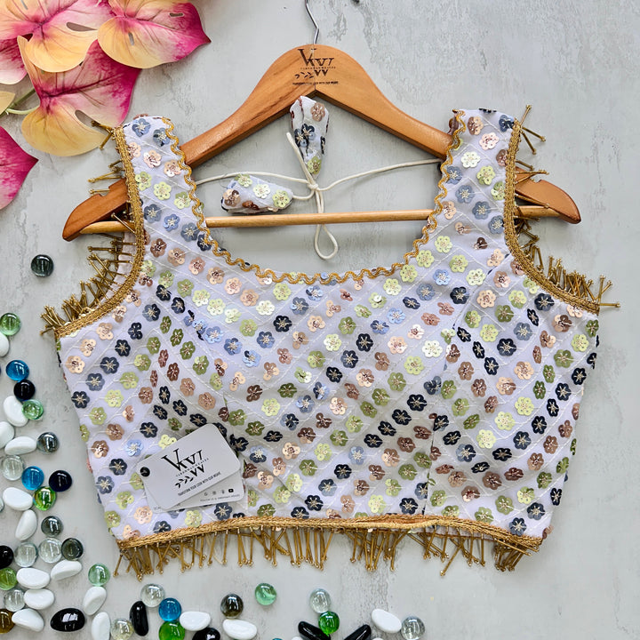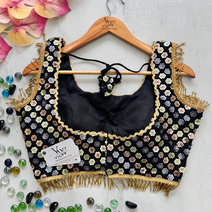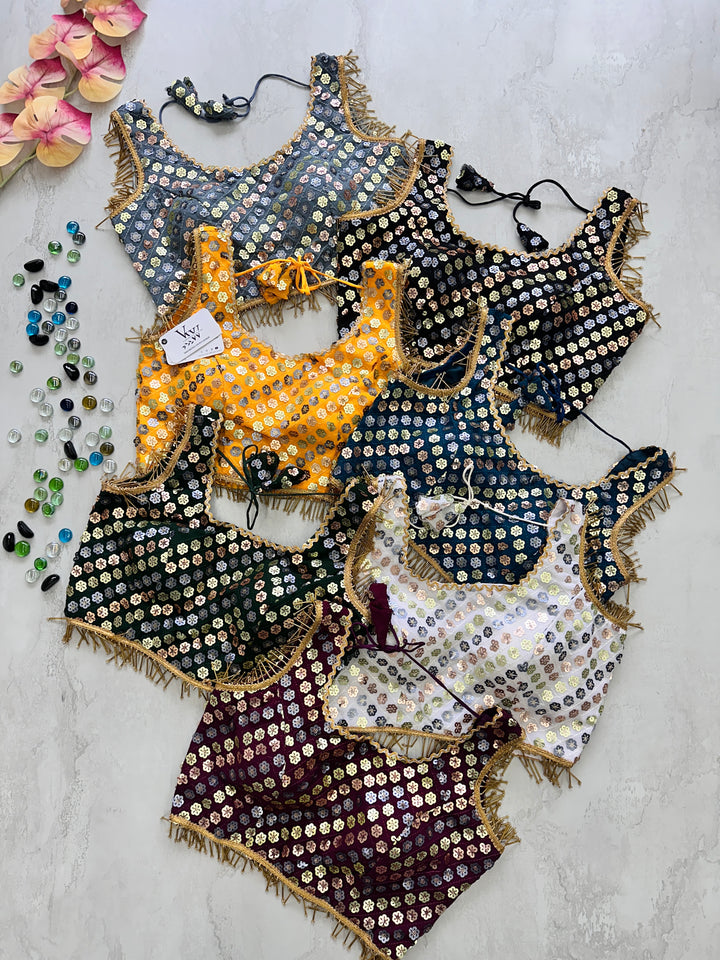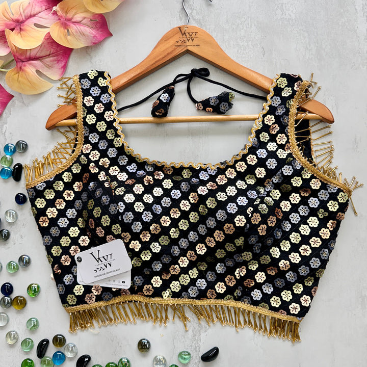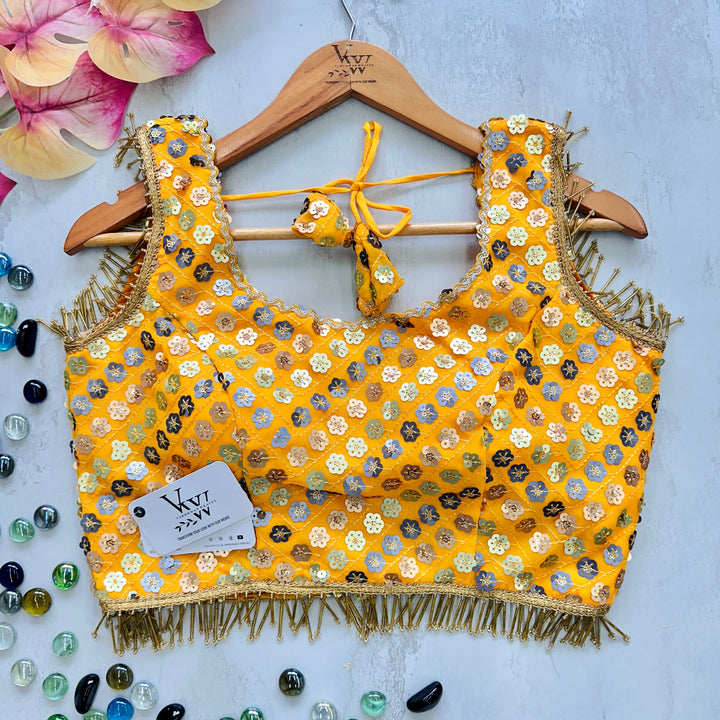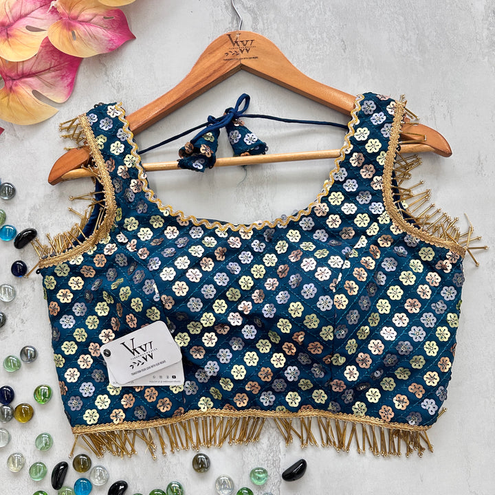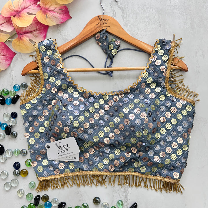 This gorgeous blouse is adorned with heavy embroidery, beautiful sequence work, and fancy lace and tassels for a stunning look. Elevate any outfit with this versatile piece. 👌