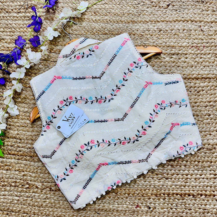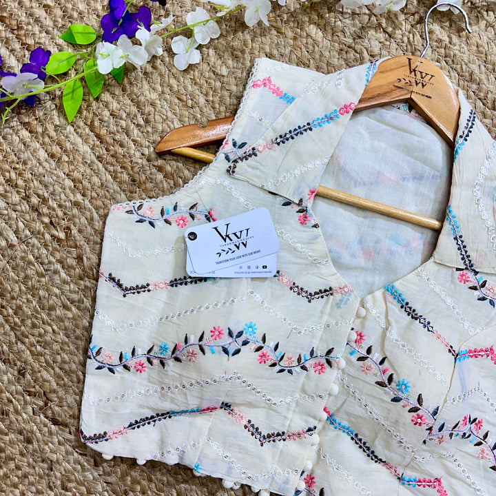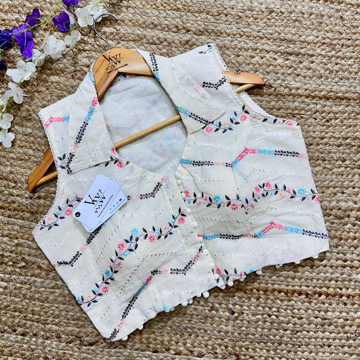 This blouse has a beautiful sleeveless collar neck design and intricate embroidery work all over for a touch of elegance. Perfect for any occasion, it's a stylish and versatile addition to any wardrobe. 😍