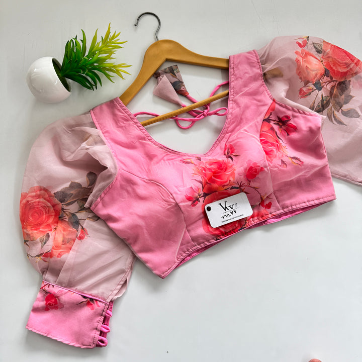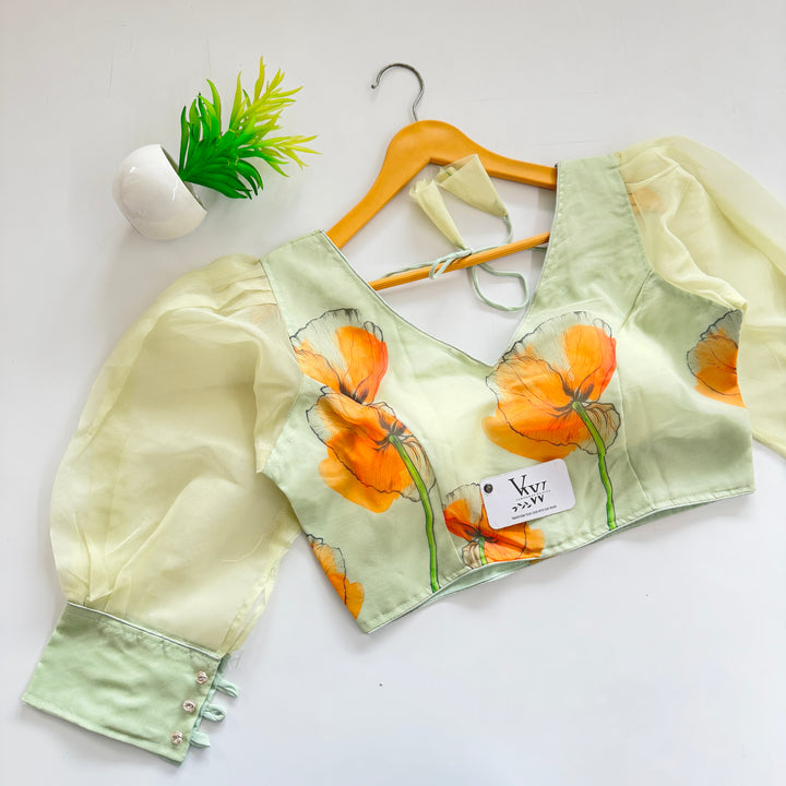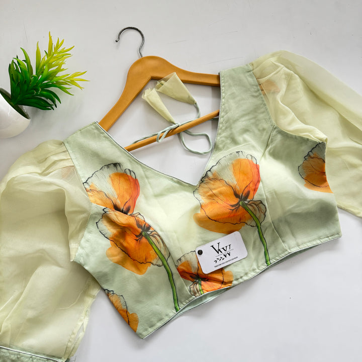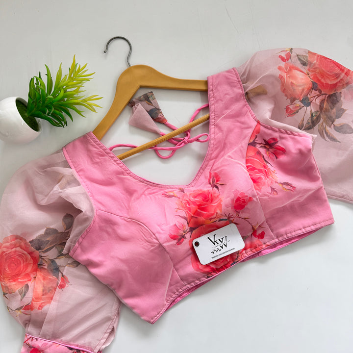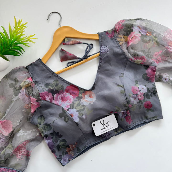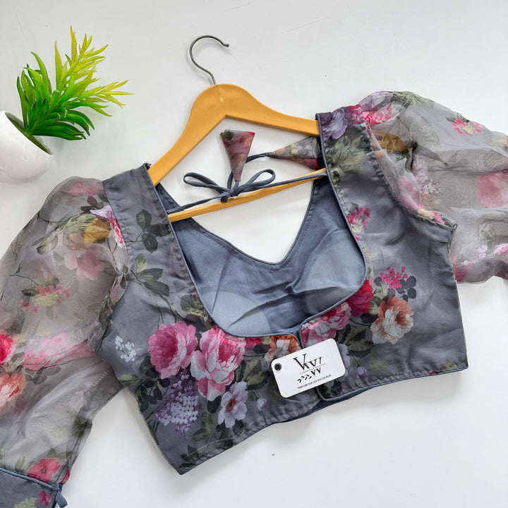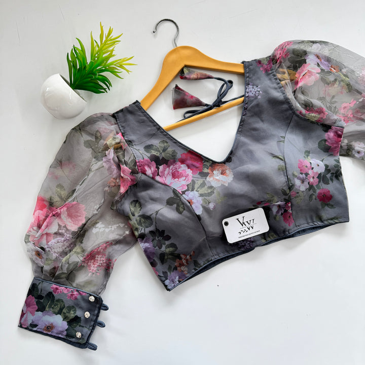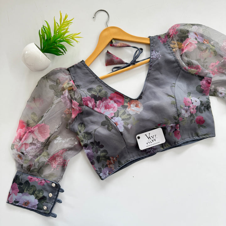 This exquisite organza blouse boasts a delicate floral print, perfect for adding a touch of sophistication to your formal wear