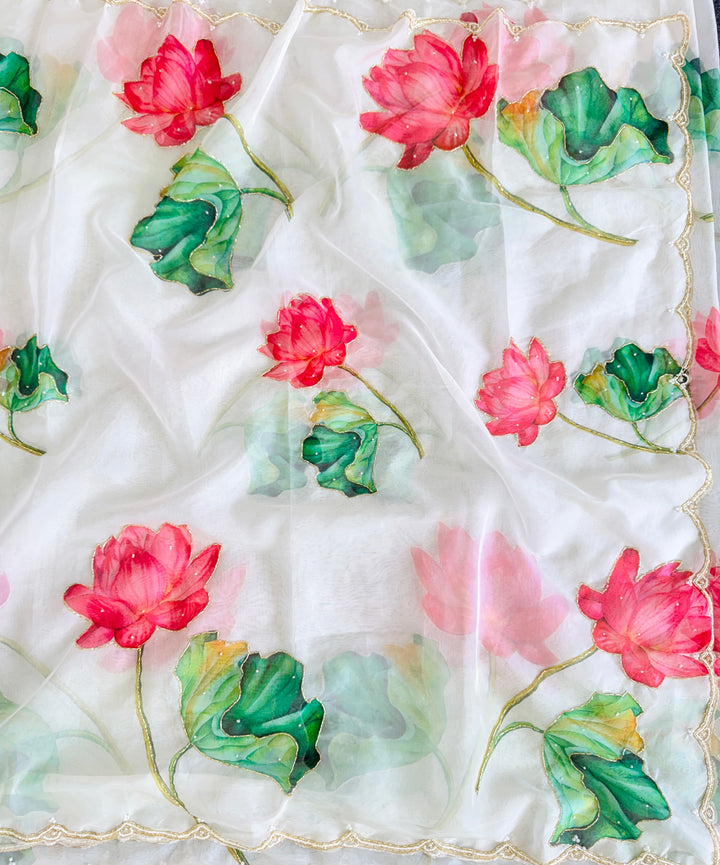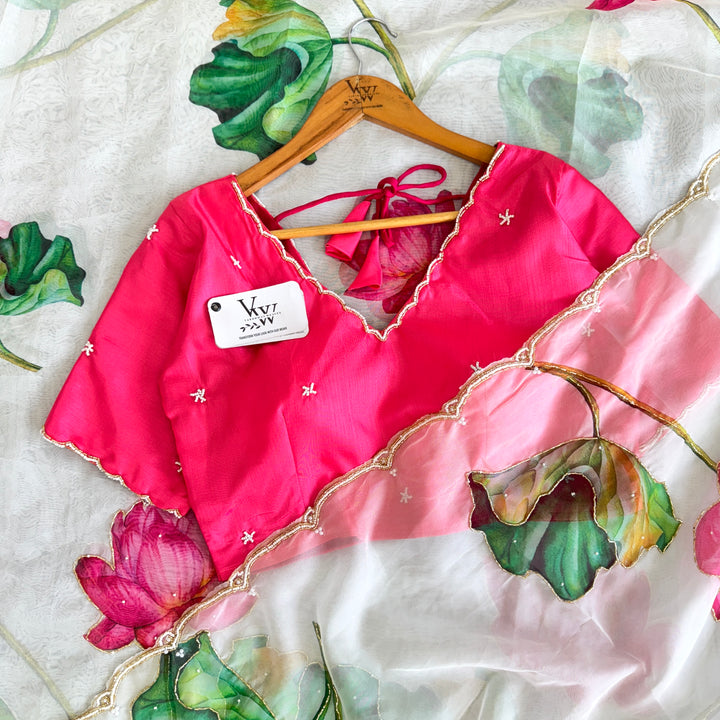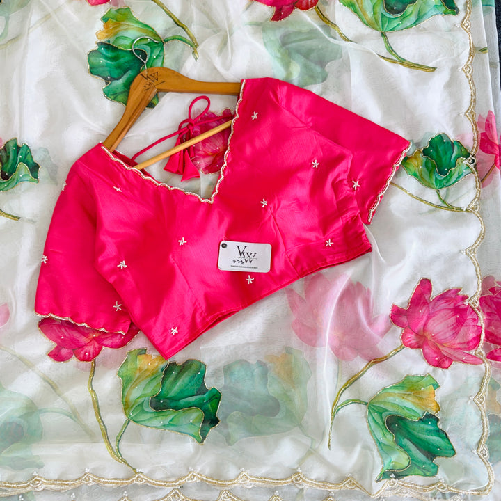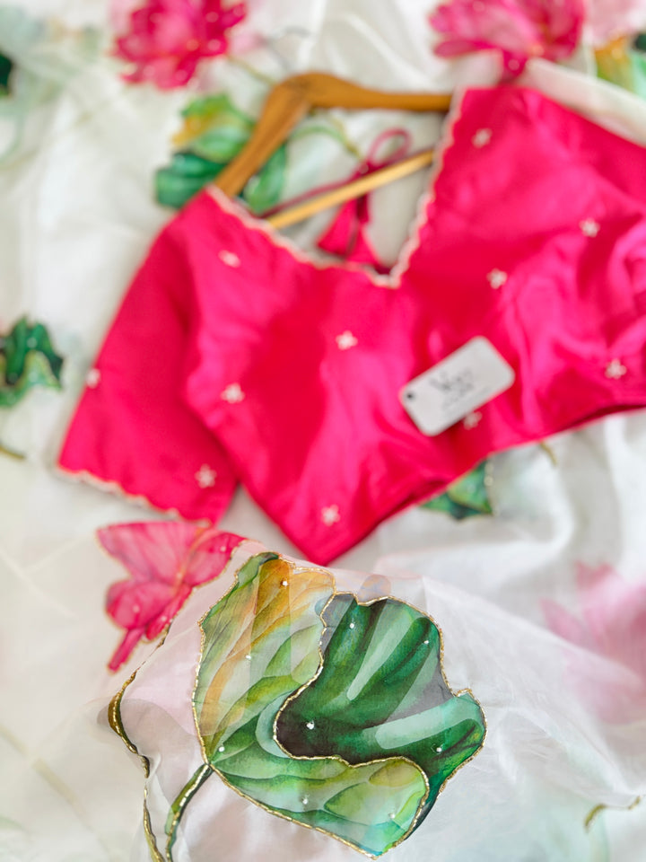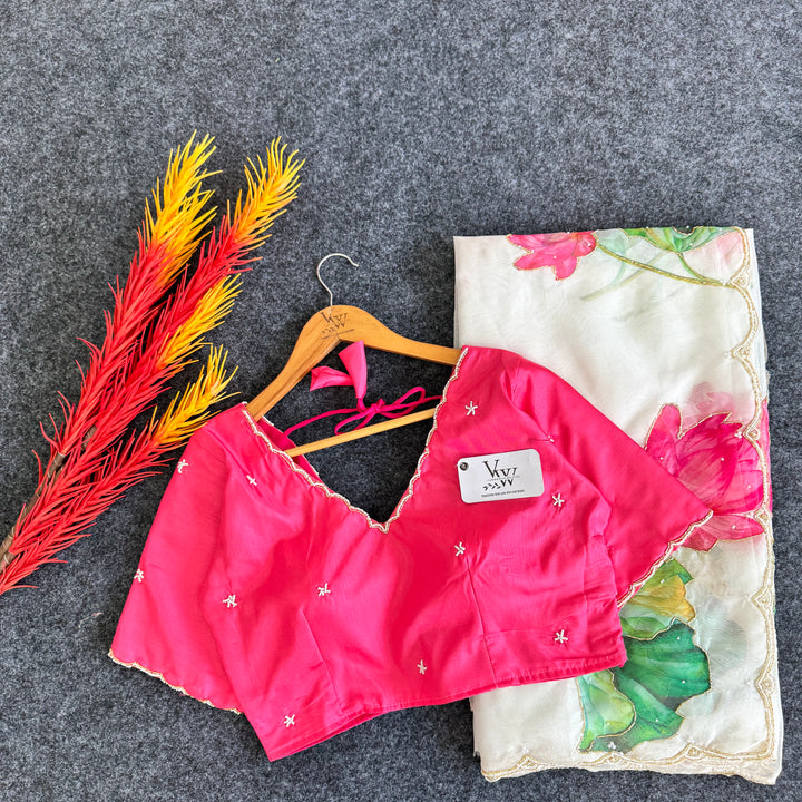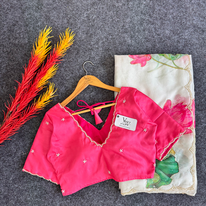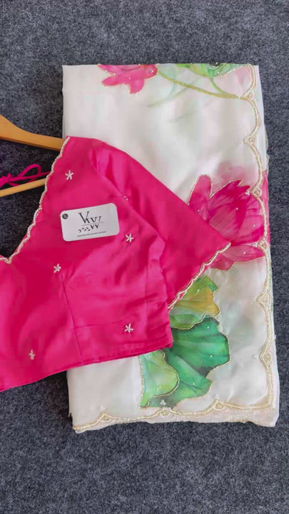 Elevate your style with this exquisite soft organza saree, featuring a stunning print cover with intricate handcrafted work all over. The saree is paired with a beautifully silk blouse, adorned with delicate handwork, creating a truly regal and eye-catching ensemble