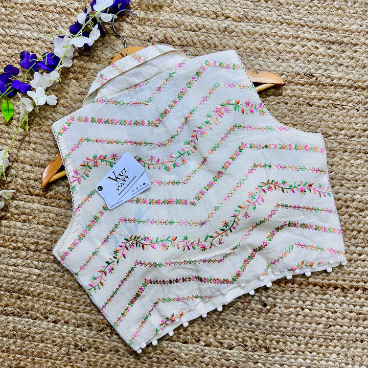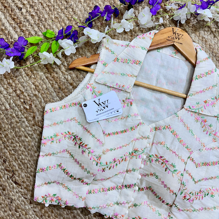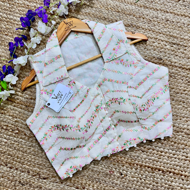 This blouse has a beautiful sleeveless collar neck design and intricate embroidery work all over for a touch of elegance. Perfect for any occasion, it's a stylish and versatile addition to any wardrobe. 😍