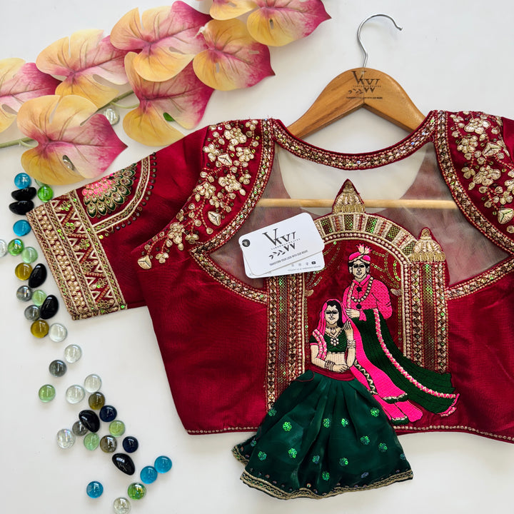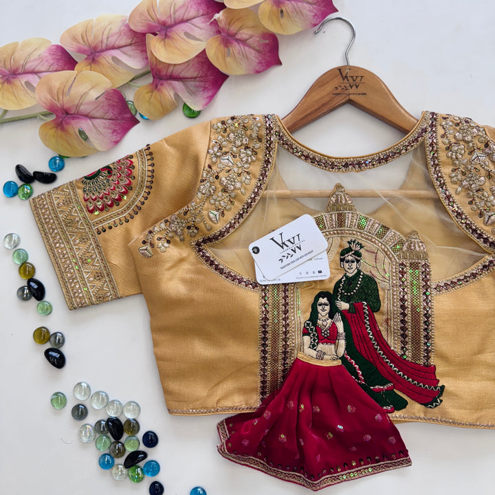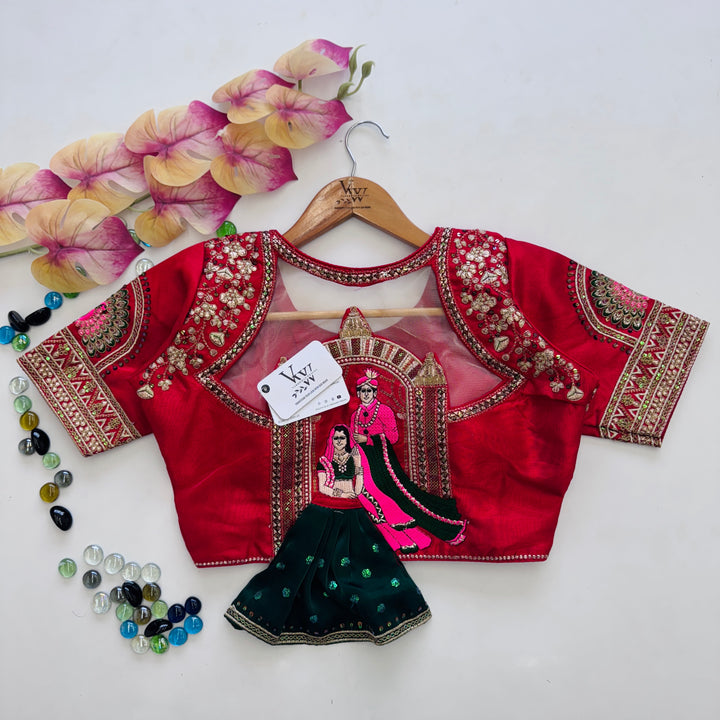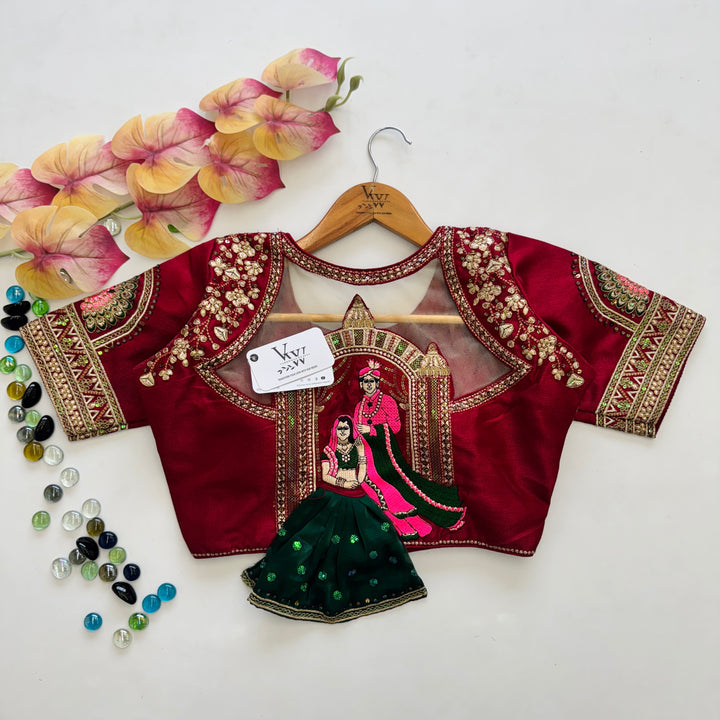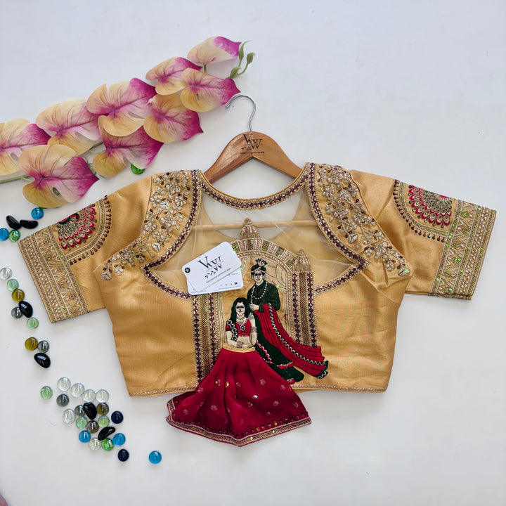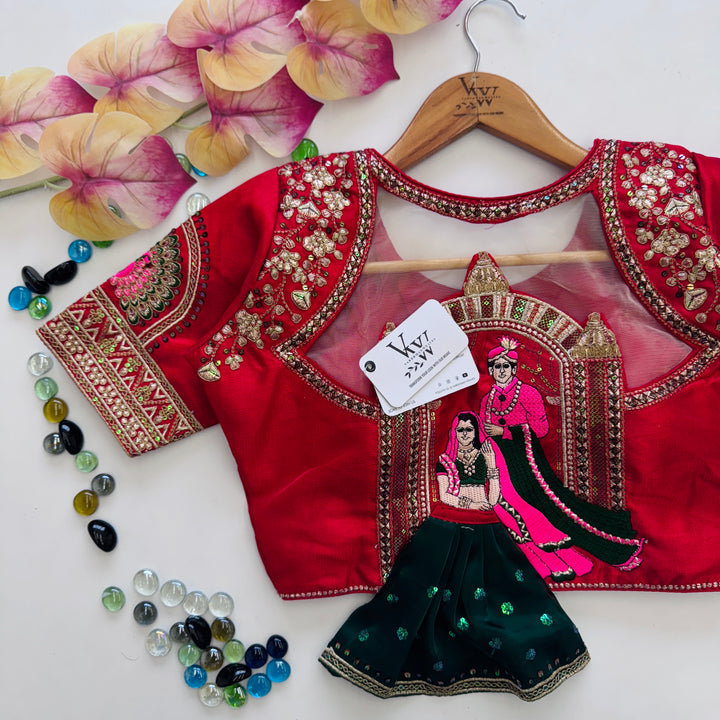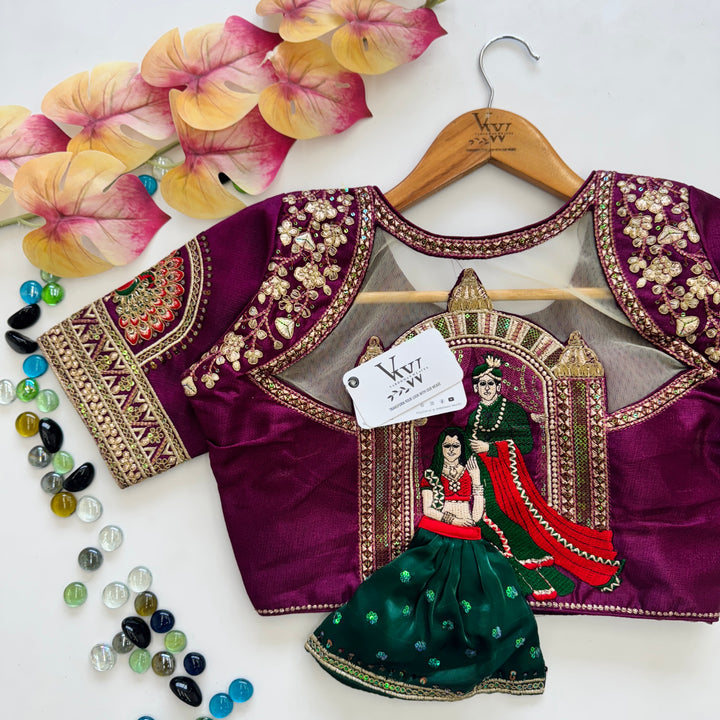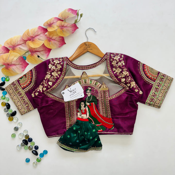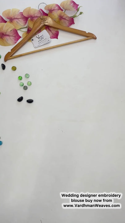 "Make your special day unforgettable in our breathtakingly beautiful bridal blouse, featuring intricate hand-touchup embroidery, sequence work, and heavy coding. Every stitch is a testament to exceptional craftsmanship."