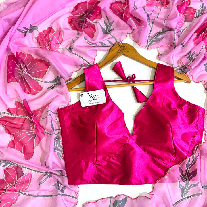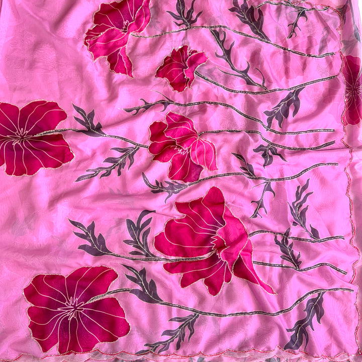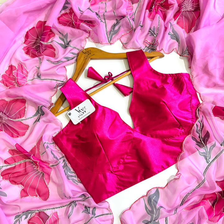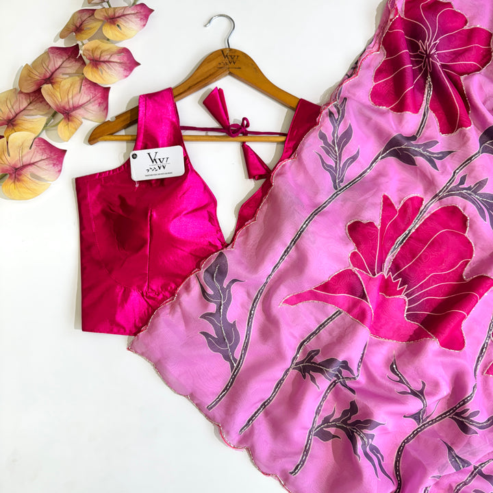 Elevate your style with this stunning saree featuring an elegant print and intricate heavy handwork. The beautiful design and vibrant colors create a visually striking effect, making it perfect for special occasions and formal events. Paired with a matching silk blouse, this saree is a true masterpiece of Indian craftsmanship. The heavy handwork adds a touch of luxury and sophistication, while the silk fabric drapes elegantly, making you feel confident and beautiful
