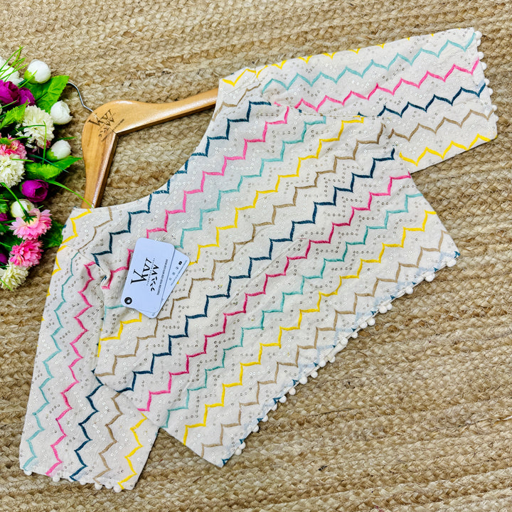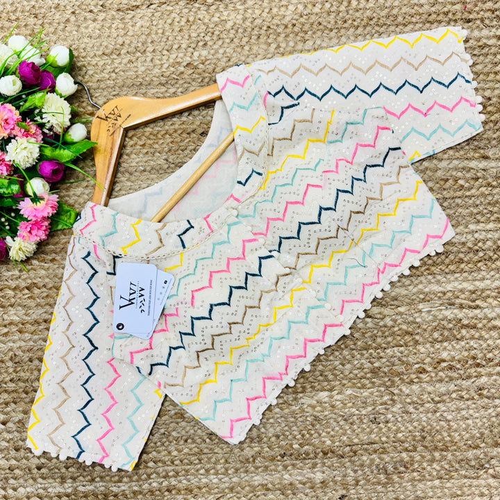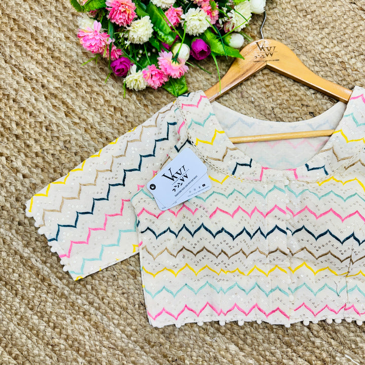 "Enhance your wardrobe with our stunning multi-work blouse. Featuring intricate embroidery and shimmering sequins, this versatile top is perfect for any occasion. Elevate your style with our unique and beautiful design, sure to make a statement."