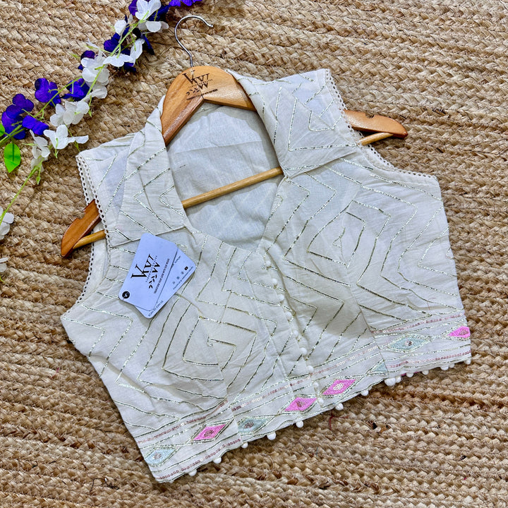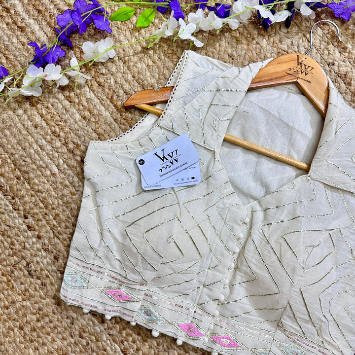 This blouse has a beautiful sleeveless collar neck design and intricate embroidery work all over for a touch of elegance. Perfect for any occasion, it's a stylish and versatile addition to any wardrobe. 😍