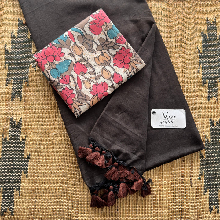 This beautiful cotton saree features intricate tassel details along the pallu, adding a touch of sophistication to the overall design. The saree is paired with a stunning printed blouse, crafted with vibrant colors and patterns that complement the saree perfectly. The combination of comfort and style makes this saree perfect for everyday wear, casual gatherings, or festive occasions