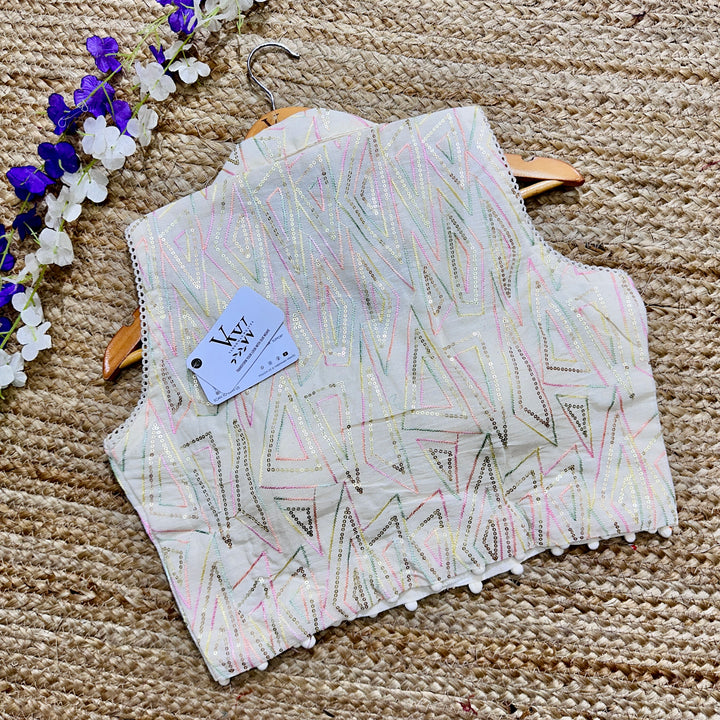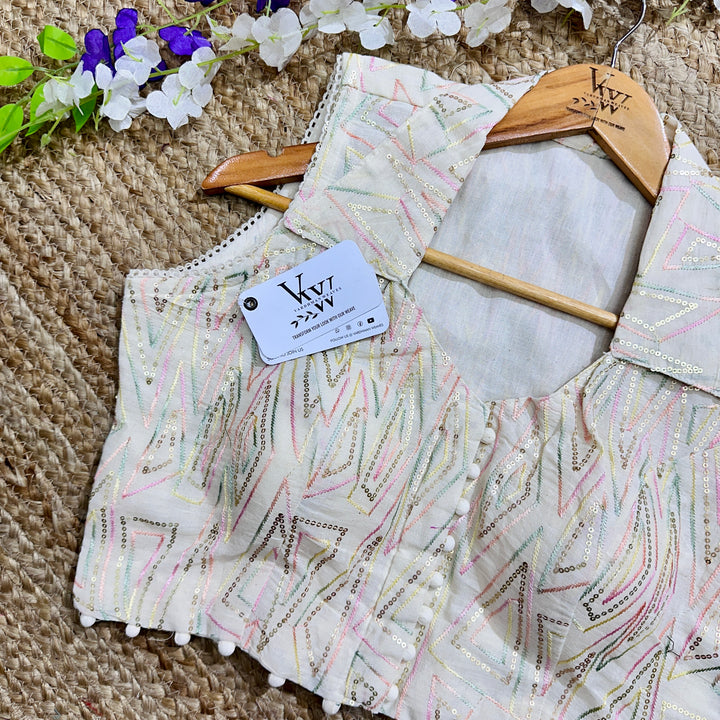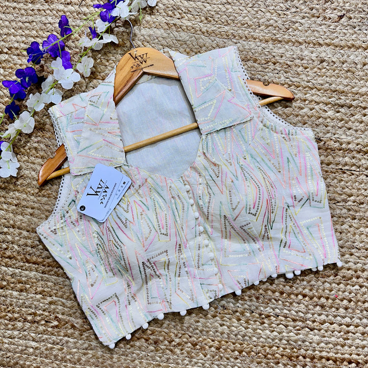 This blouse has a beautiful sleeveless collar neck design and intricate embroidery work all over for a touch of elegance. Perfect for any occasion, it's a stylish and versatile addition to any wardrobe. 😍
